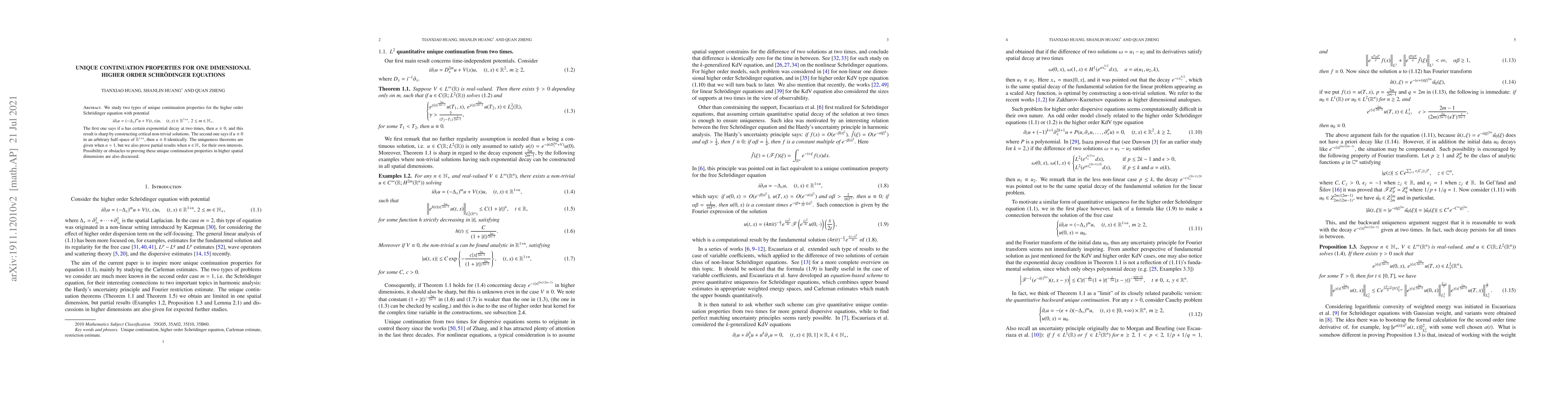 This paper investigates unique continuation properties for higher order Schrödinger equations in one dimension, proving that if a solution decays exponentially at two distinct times, it must be identically zero. It also establishes that if a solution vanishes in a half-space, it vanishes everywhere, discussing the implications and limitations for higher dimensions.