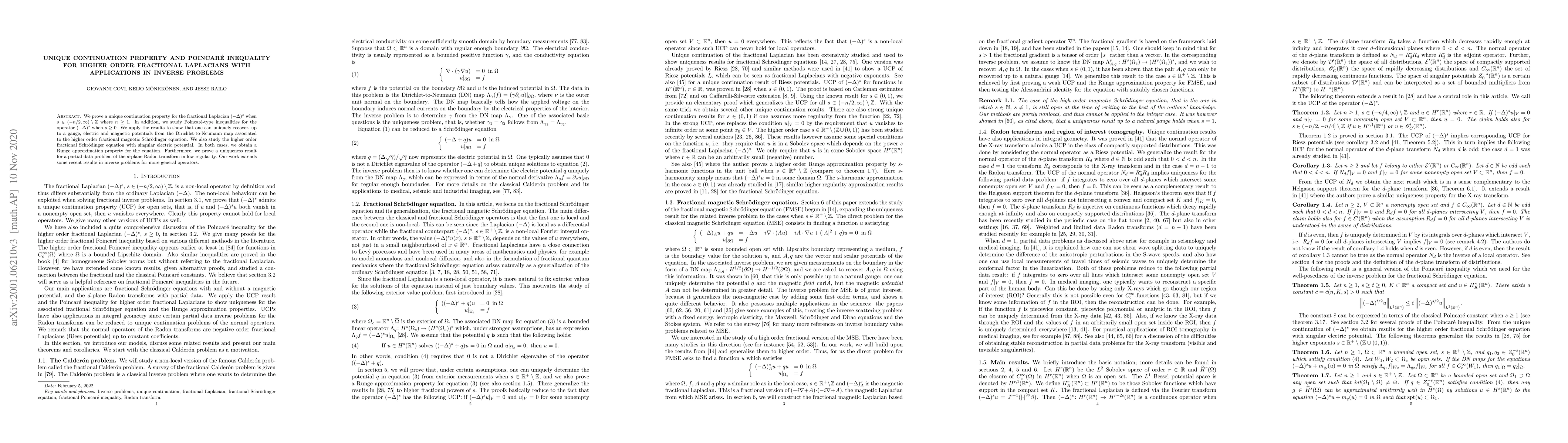 We prove a unique continuation property for the fractional Laplacian $(-\Delta)^s$ when $s \in (-n/2,\infty)\setminus \mathbb{Z}$. In addition, we study Poincar\'e-type inequalities for the operator $(-\Delta)^s$ when $s\geq 0$. We apply the results to show that one can uniquely recover, up to a gauge, electric and magnetic potentials from the Dirichlet-to-Neumann map associated to the higher order fractional magnetic Schr\"odinger equation. We also study the higher order fractional Schr\"odinger equation with singular electric potential. In both cases, we obtain a Runge approximation property for the equation. Furthermore, we prove a uniqueness result for a partial data problem of the $d$-plane Radon transform in low regularity. Our work extends some recent results in inverse problems for more general operators.