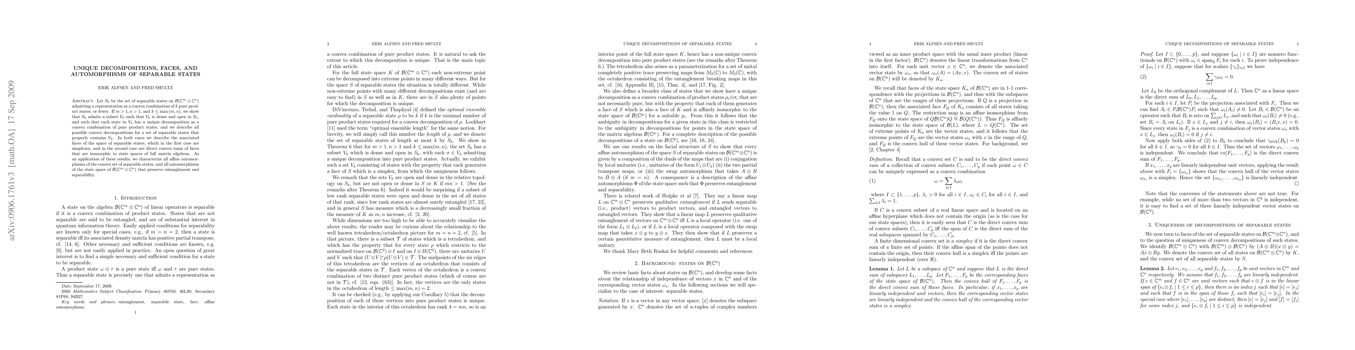 This paper demonstrates that for separable quantum states on B(C^m ⊗ C^n) with m, n > 1 and k ≤ max(m,n), a dense and open subset of states has unique decompositions into convex combinations of pure product states. It also characterizes the associated faces of the separable state space and describes affine automorphisms preserving entanglement and separability.