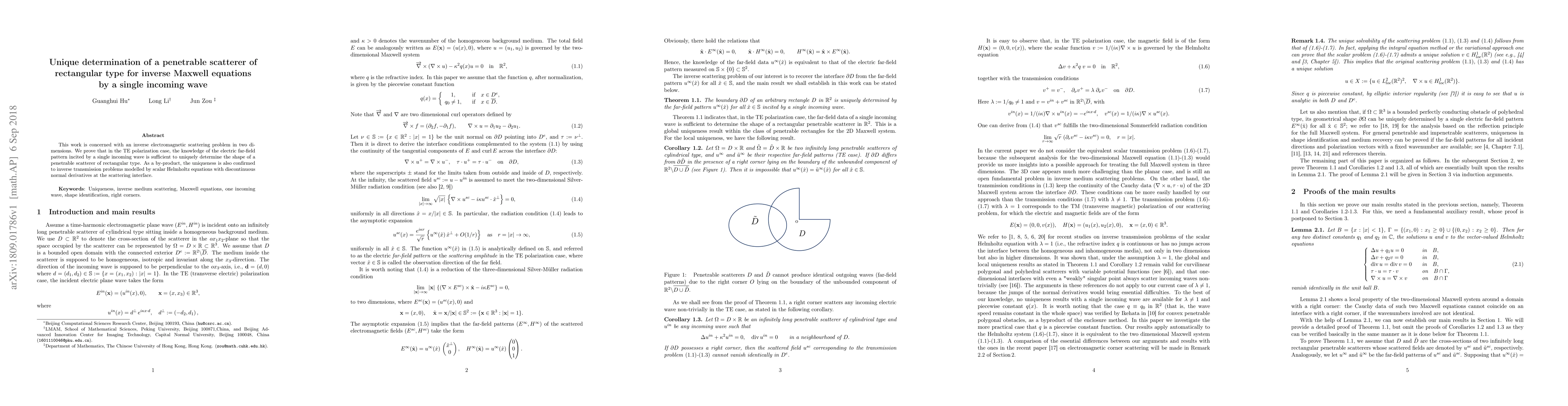 This work is concerned with an inverse electromagnetic scattering problem in two dimensions. We prove that in the TE polarization case, the knowledge of the electric far-field pattern incited by a single incoming wave is sufficient to uniquely determine the shape of a penetrable scatterer of rectangular type. As a by-product, the uniqueness is also confirmed to inverse transmission problems modelled by scalar Helmholtz equations with discontinuous normal derivatives at the scattering interface. Keywords: Uniqueness, inverse medium scattering, Maxwell equations, one incoming wave, shape identification, right corners