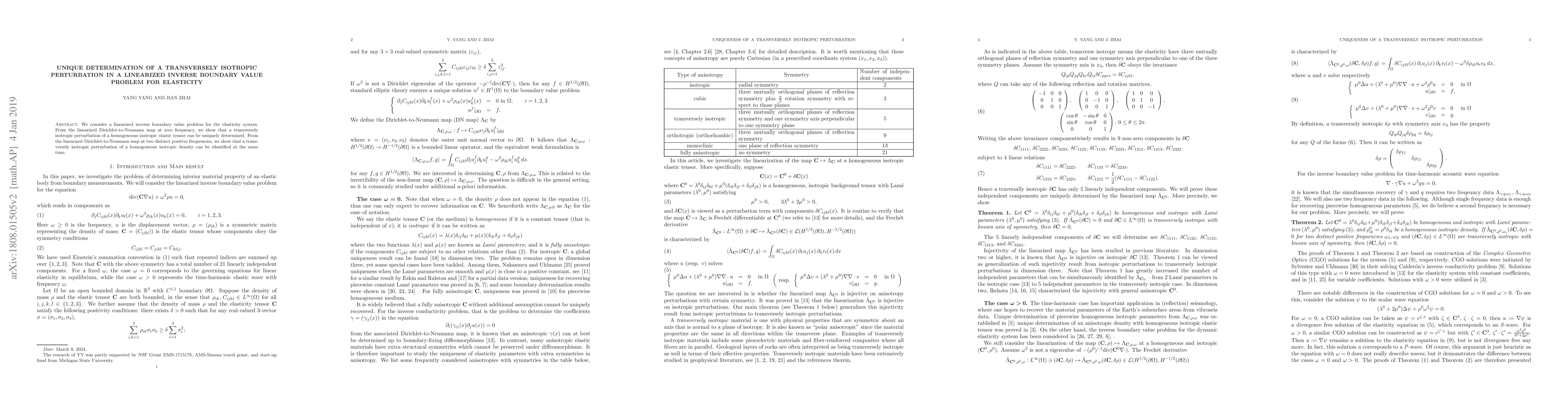 This paper addresses a linearized inverse boundary value problem for elasticity, demonstrating that a transversely isotropic perturbation in the elastic tensor can be uniquely determined from the Dirichlet-to-Neumann map at zero frequency. Additionally, it shows that a perturbation in the density can also be identified using the map at two distinct positive frequencies.