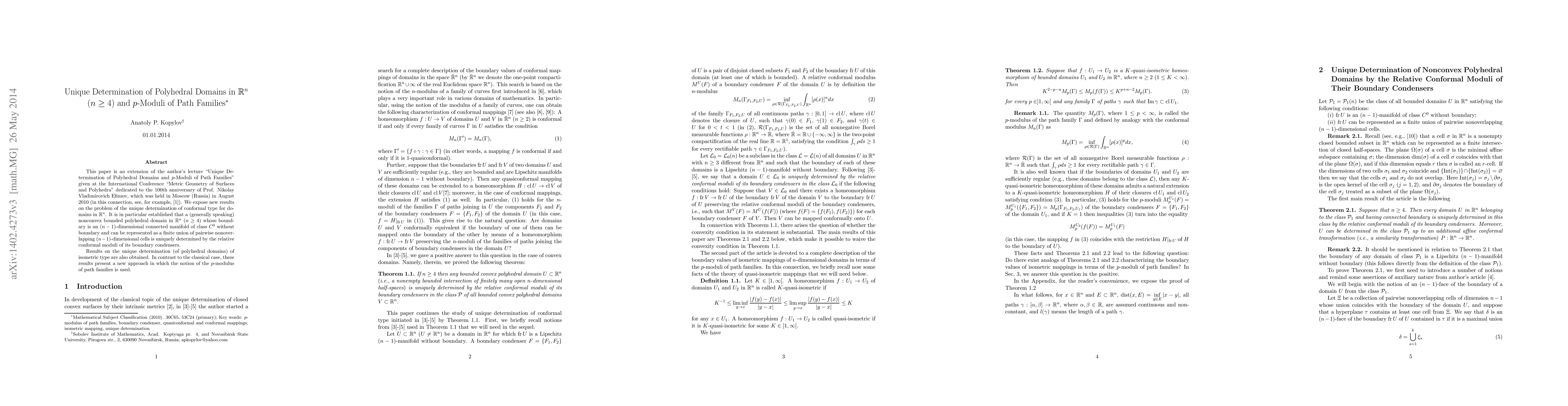 This paper is an extension of the author's lecture "Unique Determination of Polyhedral Domains and $p$-Moduli of Path Families" given at the International Conference "Metric Geometry of Surfaces and Polyhedra" dedicated to the 100th anniversary of Prof. Nikolay Vladimirovich Efimov, which was held in Moscow (Russia) in August 2010 (in this connection, see, for example [A. P. Kopylov, Unique determination of polyhedral domains and $p$-moduli of path families, In: Contemporary problems of Mathematics and Mechanics. VI. Mathematics. Issue 3. Moscow, Publishing House of Moscow university, P. 25-41 (2011)]). We expose new results on the problem of the unique determination of conformal type for domains in $\mathbb R^n$. It is in particular established that a (generally speaking) nonconvex bounded polyhedral domain in $\mathbb R^n$ ($n \ge 4$) whose boundary is an $(n - 1)$-dimensional connected manifold of class $C^0$ without boundary and can be represented as a finite union of pairwise nonoverlapping $(n-1)$-dimensional cells is uniquely determined by the relative conformal moduli of its boundary condensers. Results on the unique determination (of polyhedral domains) of isometric type are also obtained. In contrast to the classical case, these results present a new approach in which the notion of the $p$-modulus of path families is used.