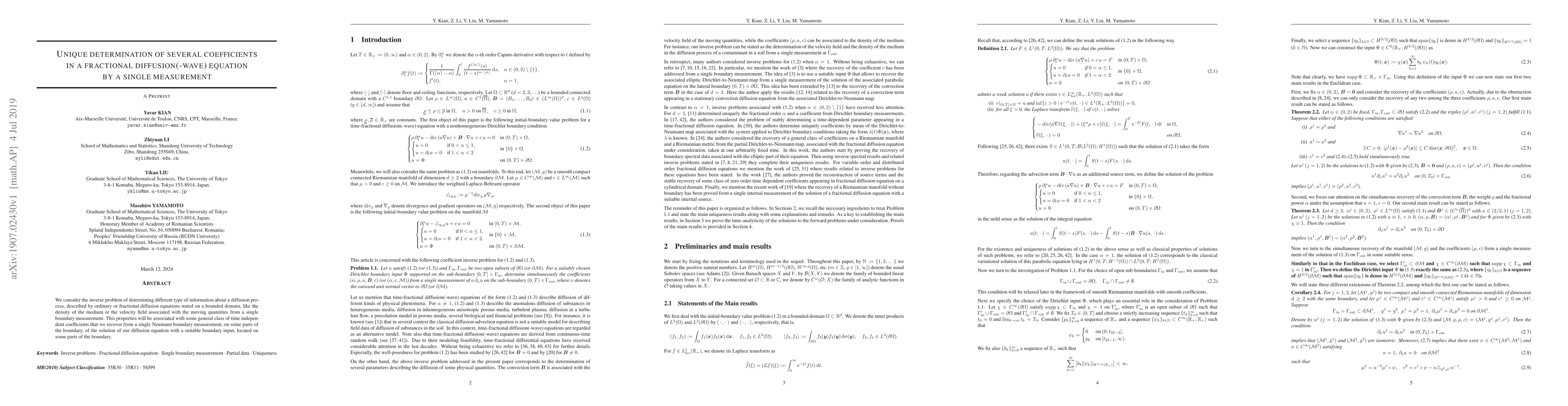 We consider the inverse problem of determining different type of information about a diffusion process, described by ordinary or fractional diffusion equations stated on a bounded domain, like the density of the medium or the velocity field associated with the moving quantities from a single boundary measurement. This properties will be associated with some general class of time independent coefficients that we recover from a single Neumann boundary measurement, on some parts of the boundary, of the solution of our diffusion equation with a suitable boundary input, located on some parts of the boundary.