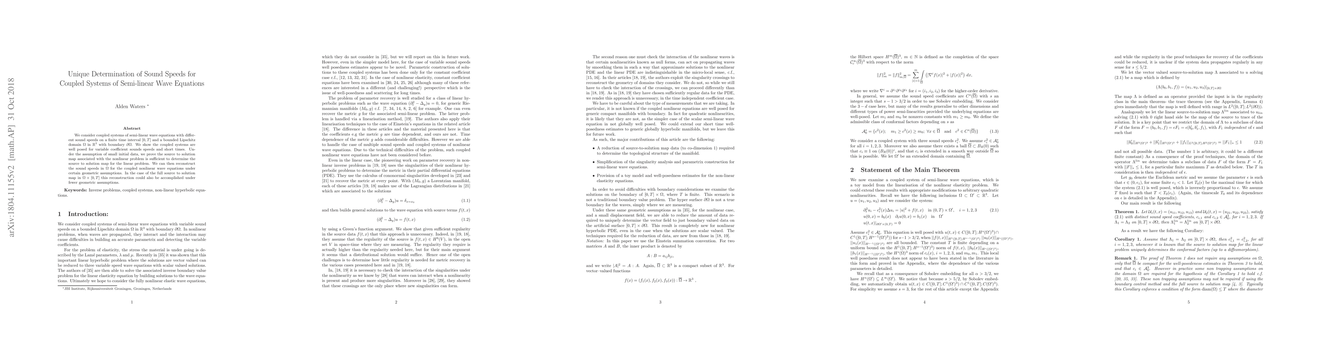 We consider coupled systems of semi-linear wave equations with different sound speeds on a finite time interval $[0,T]$ and a bounded Lipschitz domain $\Omega$ in $\mathbb{R}^3$, with boundary $\partial\Omega$. We show the coupled systems are well posed for variable coefficient sounds speeds and short times. Under the assumption of small initial data, we prove the source to solutions map on $[0,T]\times\partial\Omega$ associated with the nonlinear problem is sufficient to determine the source-to-solution map for the linear problem. We can then reconstruct the sound speeds in $\Omega$ for the coupled nonlinear wave equations under certain geometric assumptions. In the case of the full source to solution map in $\Omega\times[0,T]$ this reconstruction could also be accomplished under fewer geometric assumptions.
