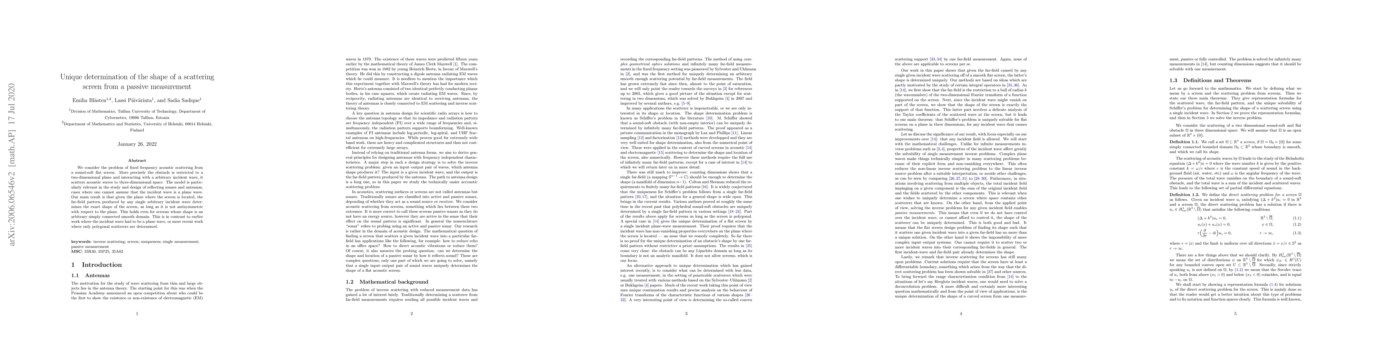 This research proves that the exact shape of a sound-soft flat screen can be uniquely determined from the far-field pattern of a single arbitrary incident acoustic wave, applicable to complex screen shapes and contrasting with previous works requiring plane waves or polygonal scatterers.