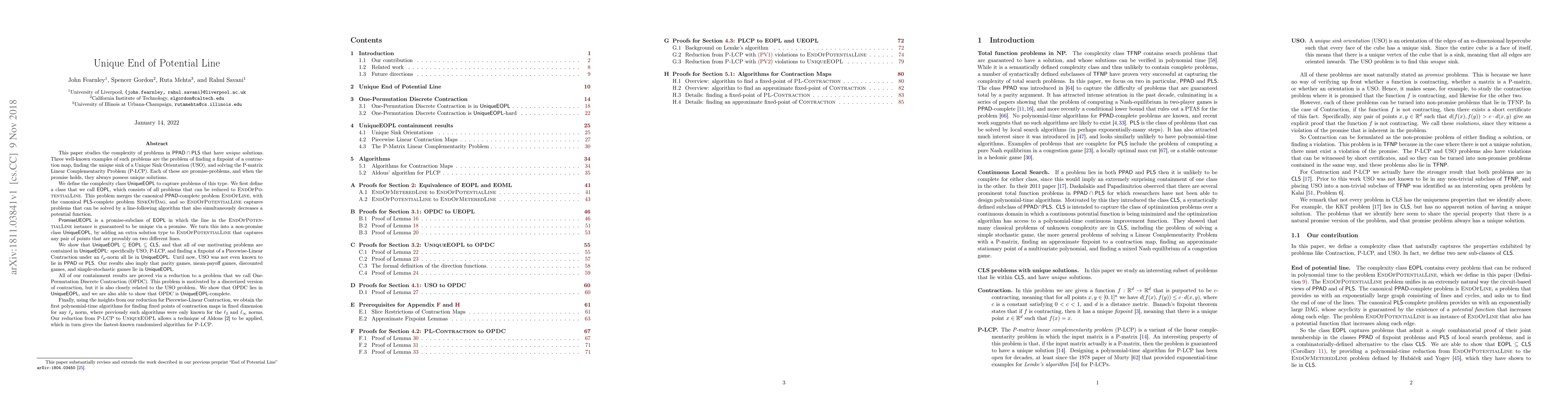 This paper studies the complexity of problems in PPAD $\cap$ PLS that have unique solutions. Three well-known examples of such problems are the problem of finding a fixpoint of a contraction map, finding the unique sink of a Unique Sink Orientation (USO), and solving the P-matrix Linear Complementarity Problem (P-LCP). Each of these are promise-problems, and when the promise holds, they always possess unique solutions. We define the complexity class UEOPL to capture problems of this type. We first define a class that we call EOPL, which consists of all problems that can be reduced to End-of-Potential-Line. This problem merges the canonical PPAD-complete problem End-of-Line, with the canonical PLS-complete problem Sink-of-Dag, and so EOPL captures problems that can be solved by a line-following algorithm that also simultaneously decreases a potential function. Promise-UEOPL is a promise-subclass of EOPL in which the line in the End-of-Potential-Line instance is guaranteed to be unique via a promise. We turn this into a non-promise class UEOPL, by adding an extra solution type to EOPL that captures any pair of points that are provably on two different lines. We show that UEOPL $\subseteq$ EOPL $\subseteq$ CLS, and that all of our motivating problems are contained in UEOPL: specifically USO, P-LCP, and finding a fixpoint of a Piecewise-Linear Contraction under an $\ell_p$-norm all lie in UEOPL. Our results also imply that parity games, mean-payoff games, discounted games, and simple-stochastic games lie in UEOPL. All of our containment results are proved via a reduction to a problem that we call One-Permutation Discrete Contraction (OPDC). This problem is motivated by a discretized version of contraction, but it is also closely related to the USO problem. We show that OPDC lies in UEOPL, and we are also able to show that OPDC is UEOPL-complete.