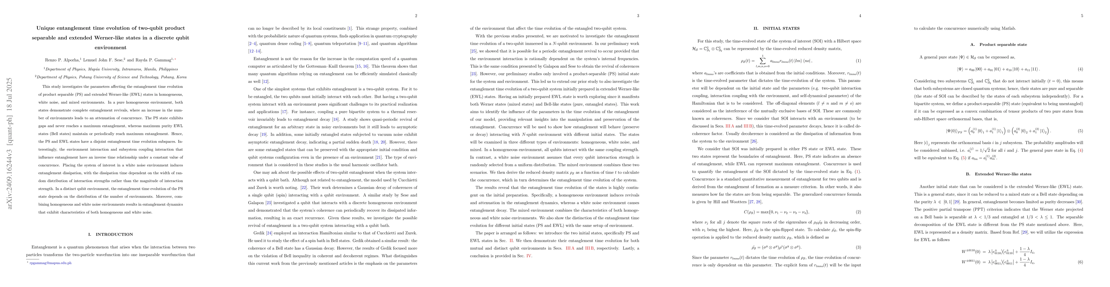 This study investigates the parameters affecting the entanglement time evolution of product separable (PS) and extended Werner-like (EWL) states in homogeneous, white noise, and mixed environments. In a pure homogeneous environment, both states demonstrate complete entanglement revivals, where an increase in the number of environments leads to an attenuation of concurrence. The PS state exhibits gaps and never reaches a maximum entanglement, whereas maximum purity EWL states (Bell states) maintain or periodically reach maximum entanglement. Hence, the PS and EWL states have a disjoint entanglement time evolution subspaces. Interestingly, the environment interaction and subsystem coupling interaction that influence entanglement have an inverse time relationship under a constant value of concurrence. Placing the system of interest in a white noise environment induces entanglement dissipation, with the dissipation time dependent on the width of random distribution of interaction strengths rather than the magnitude of interaction strength. In a distinct qubit environment, the entanglement time evolution of the PS state depends on the distribution of the number of environments. Moreover, combining homogeneous and white noise environments results in entanglement dynamics that exhibit characteristics of both homogeneous and white noise.