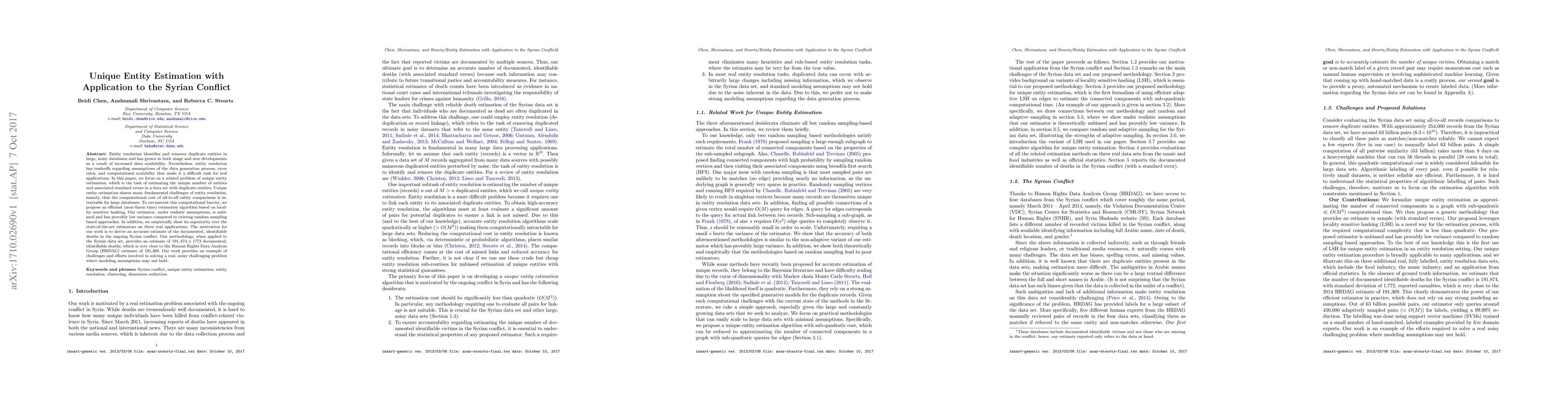This paper proposes an efficient unique entity estimation algorithm using locality sensitive hashing to estimate the number of unique entities in large, noisy datasets, demonstrating its effectiveness in estimating the documented deaths in the Syrian conflict at $191,874 \pm 1772$, closely matching the HRDAG estimate. The method shows lower variance and better performance compared to existing random sampling approaches.