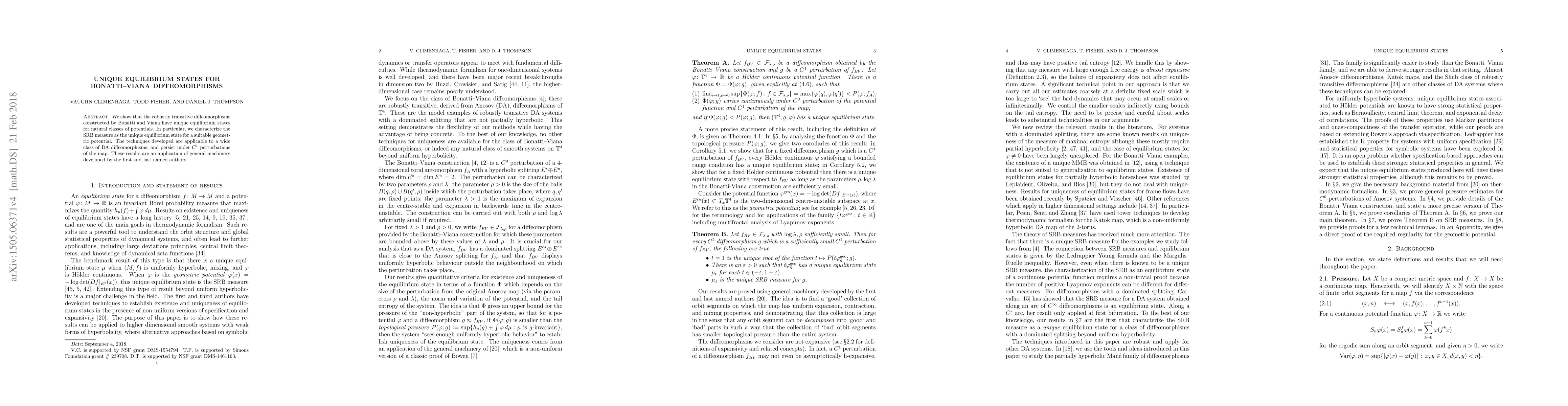 The paper demonstrates that Bonatti-Viana's robustly transitive diffeomorphisms have unique equilibrium states for specific potential classes, pinpointing the SRB measure as the unique equilibrium state for a suitable geometric potential. These findings apply broadly to DA diffeomorphisms and are resilient under minor map perturbations, showcasing robustness and applicability of the developed machinery.