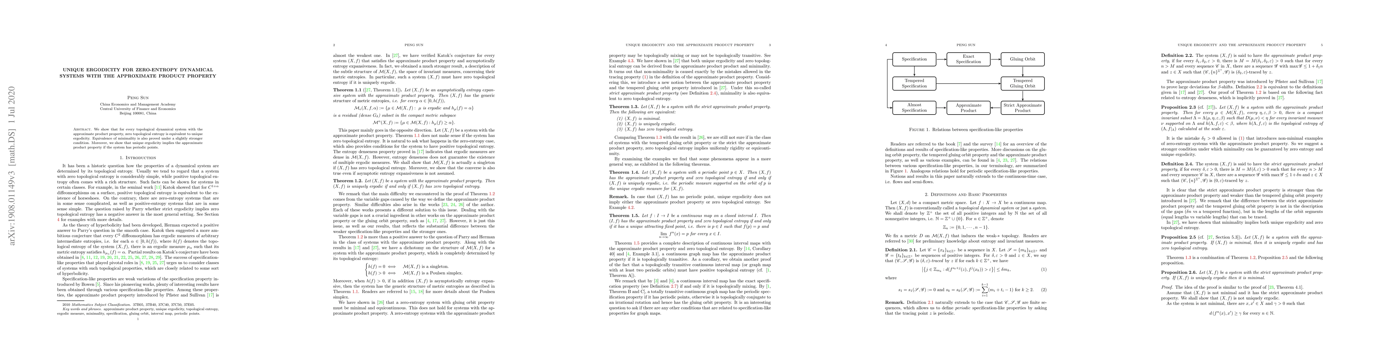 This paper establishes that zero topological entropy in dynamical systems with the approximate product property guarantees unique ergodicity. It also proves the equivalence of minimality under a slightly stronger condition, and demonstrates that unique ergodicity implies the approximate product property when the system has periodic points.