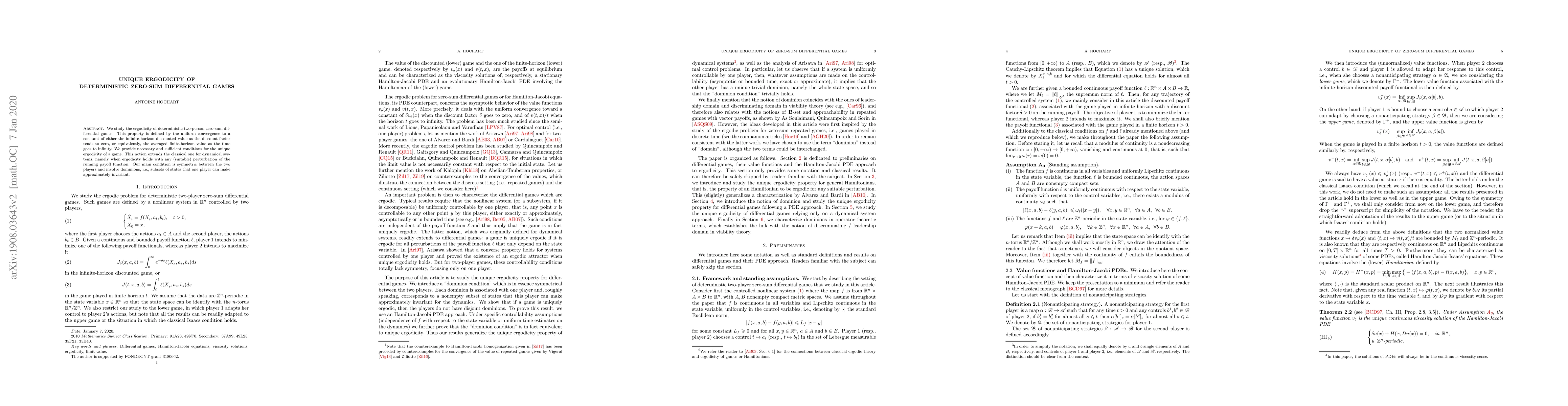 This paper investigates the unique ergodicity in deterministic two-person zero-sum differential games, establishing necessary and sufficient conditions for this property. The unique ergodicity extends classical ergodicity in dynamical systems, focusing on dominions that players can control.