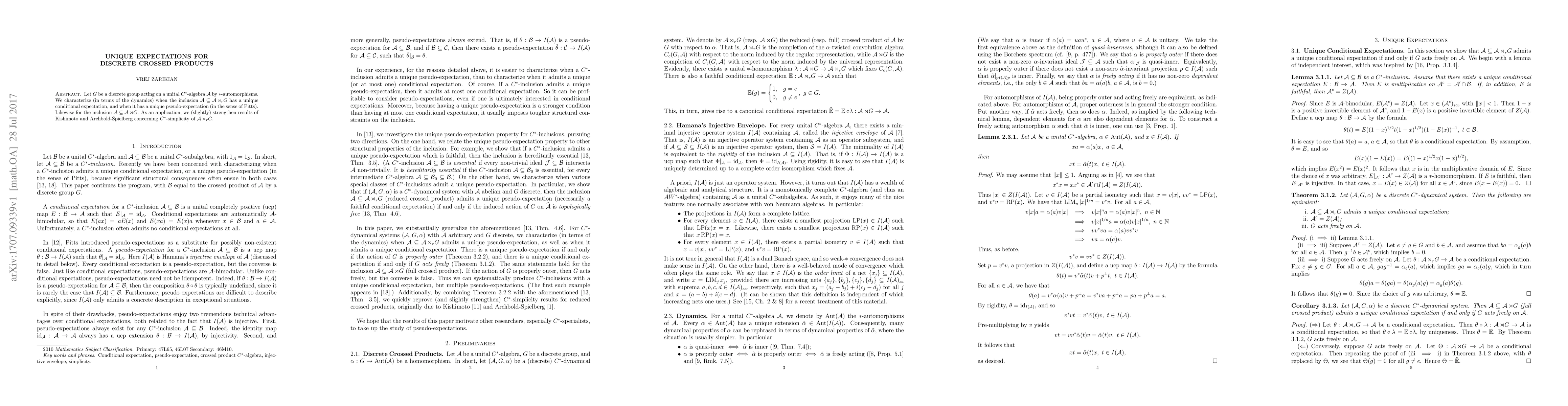 Let $G$ be a discrete group acting on a unital $C^*$-algebra $\mathcal{A}$ by $*$-automorphisms. We characterize (in terms of the dynamics) when the inclusion $\mathcal{A} \subseteq \mathcal{A} \rtimes_r G$ has a unique conditional expectation, and when it has a unique pseudo-expectation (in the sense of Pitts). Likewise for the inclusion $\mathcal{A} \subseteq \mathcal{A} \rtimes G$. As an application, we (slightly) strengthen results of Kishimoto and Archbold-Spielberg concerning $C^*$-simplicity of $\mathcal{A} \rtimes_r G$.