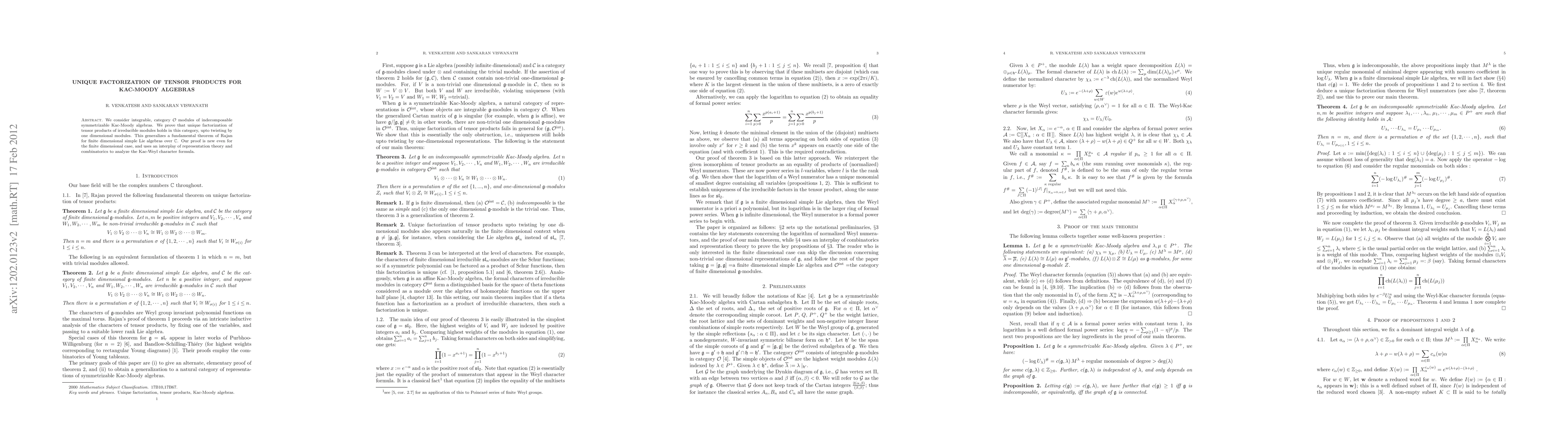 We consider integrable, category O-modules of indecomposable symmetrizable Kac-Moody algebras. We prove that unique factorization of tensor products of irreducible modules holds in this category, upto twisting by one dimensional modules. This generalizes a fundamental theorem of Rajan for finite dimensional simple Lie algebras over C. Our proof is new even for the finite dimensional case, and uses an interplay of representation theory and combinatorics to analyze the Kac-Weyl character formula.
