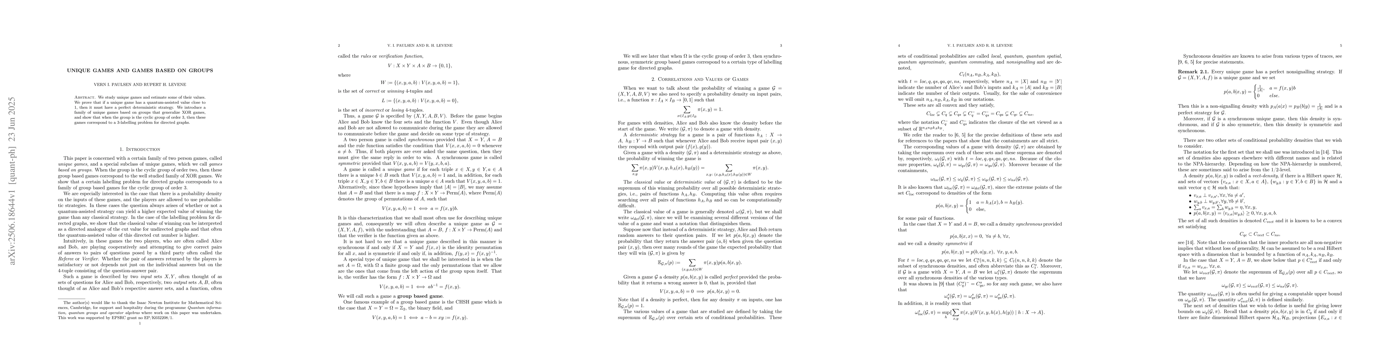 This paper proves that a unique game with a quantum-assisted value near 1 must have a perfect deterministic strategy. It introduces group-based unique games, showing that with the cyclic group of order 3, these games equate to a 3-labelling problem for directed graphs.