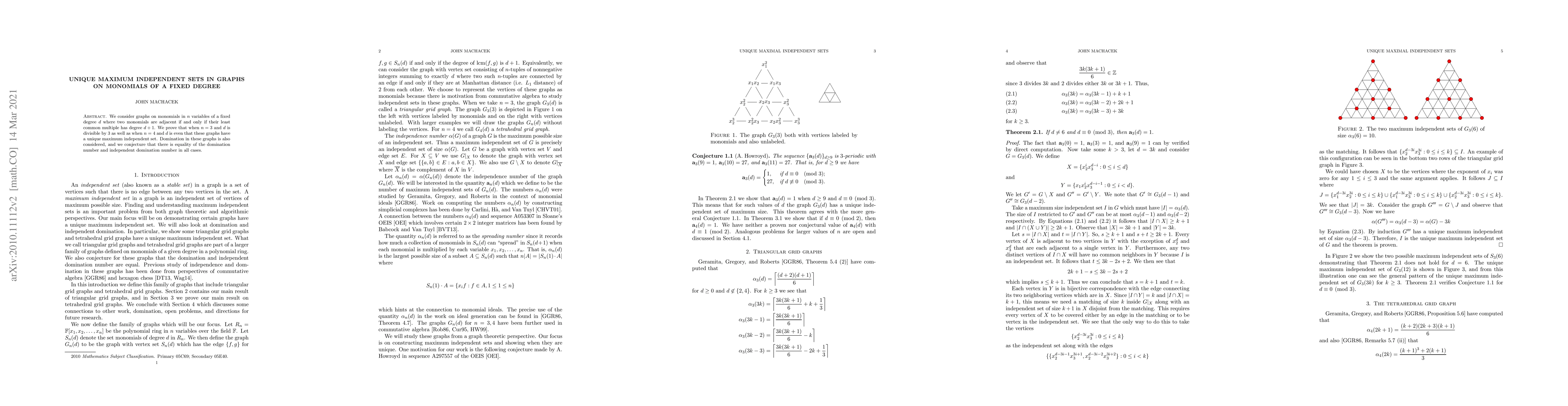 The paper proves that certain graphs on monomials have a unique maximum independent set, specifically for n=3 and d divisible by 3, and n=4 with even d. It also conjectures equality of domination number and independent domination number in all cases.