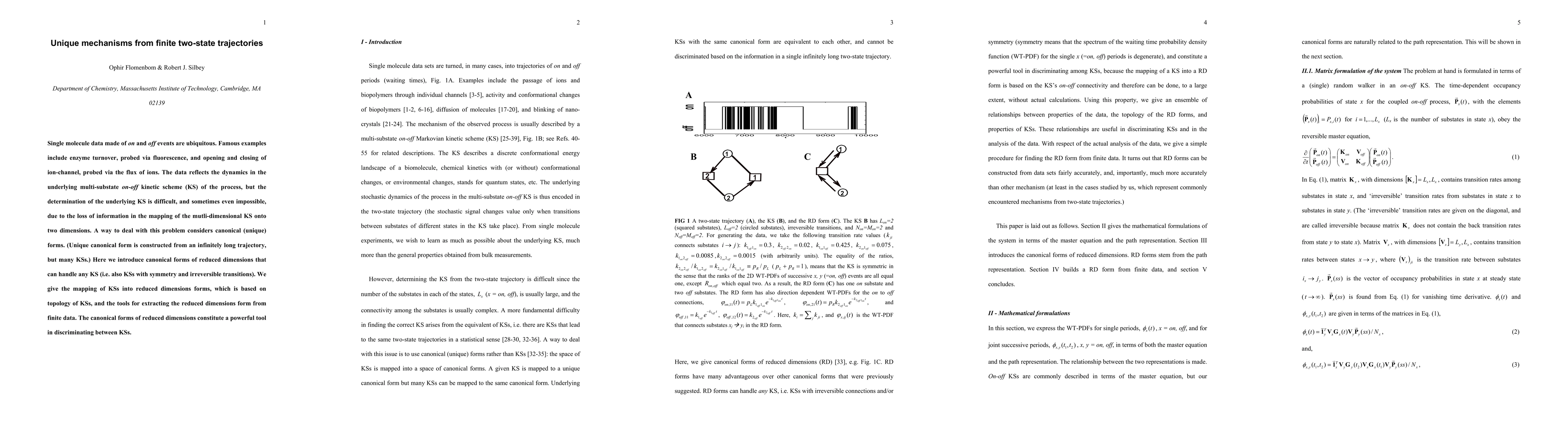 Single molecule data made of on and off events are ubiquitous. Famous examples include enzyme turnover, probed via fluorescence, and opening and closing of ion-channel, probed via the flux of ions. The data reflects the dynamics in the underlying multi-substate on-off kinetic scheme (KS) of the process, but the determination of the underlying KS is difficult, and sometimes even impossible, due to the loss of information in the mapping of the mutli-dimensional KS onto two dimensions. A way to deal with this problem considers canonical (unique) forms. (Unique canonical form is constructed from an infinitely long trajectory, but many KSs.) Here we introduce canonical forms of reduced dimensions that can handle any KS (i.e. also KSs with symmetry and irreversible transitions). We give the mapping of KSs into reduced dimensions forms, which is based on topology of KSs, and the tools for extracting the reduced dimensions form from finite data. The canonical forms of reduced dimensions constitute a powerful tool in discriminating between KSs.