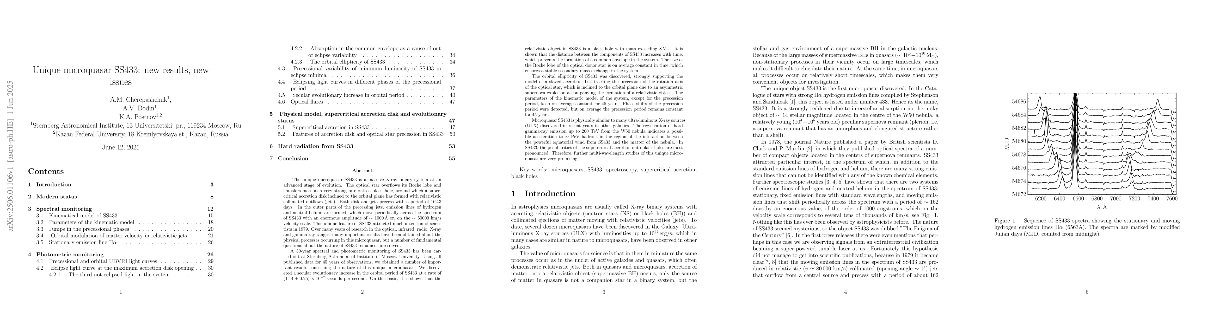 The research on microquasar SS433 reveals a black hole with a mass greater than 8 solar masses, as evidenced by a secular increase in its orbital period. The study also finds a growing separation between the binary components, ruling out a common envelope. The system's orbital ellipticity supports a model of a precessing accretion disk, while the kinematic parameters remain steady over 45 years, except for occasional precession period phase jumps.