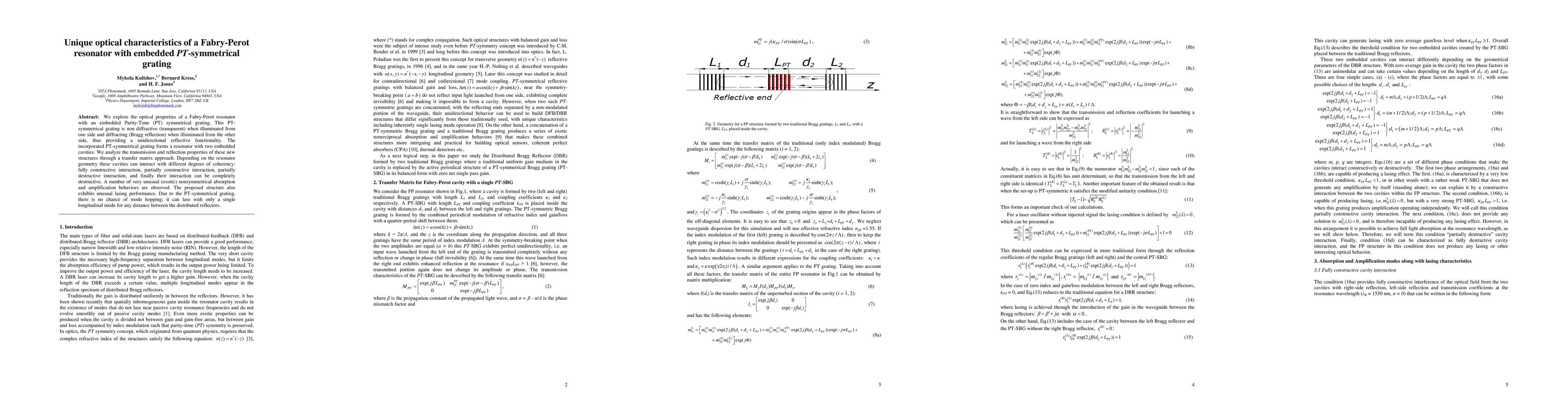 We explore the optical properties of a Fabry-Perot resonator with an embedded Parity-Time (PT) symmetrical grating. This PT-symmetrical grating is non diffractive (transparent) when illuminated from one side and diffracting (Bragg reflection) when illuminated from the other side, thus providing a unidirectional reflective functionality. The incorporated PT-symmetrical grating forms a resonator with two embedded cavities. We analyze the transmission and reflection properties of these new structures through a transfer matrix approach. Depending on the resonator geometry these cavities can interact with different degrees of coherency: fully constructive interaction, partially constructive interaction, partially destructive interaction, and finally their interaction can be completely destructive. A number of very unusual (exotic) nonsymmetrical absorption and amplification behaviors are observed. The proposed structure also exhibits unusual lasing performance. Due to the PT-symmetrical grating, there is no chance of mode hopping; it can lase with only a single longitudinal mode for any distance between the distributed reflectors.
