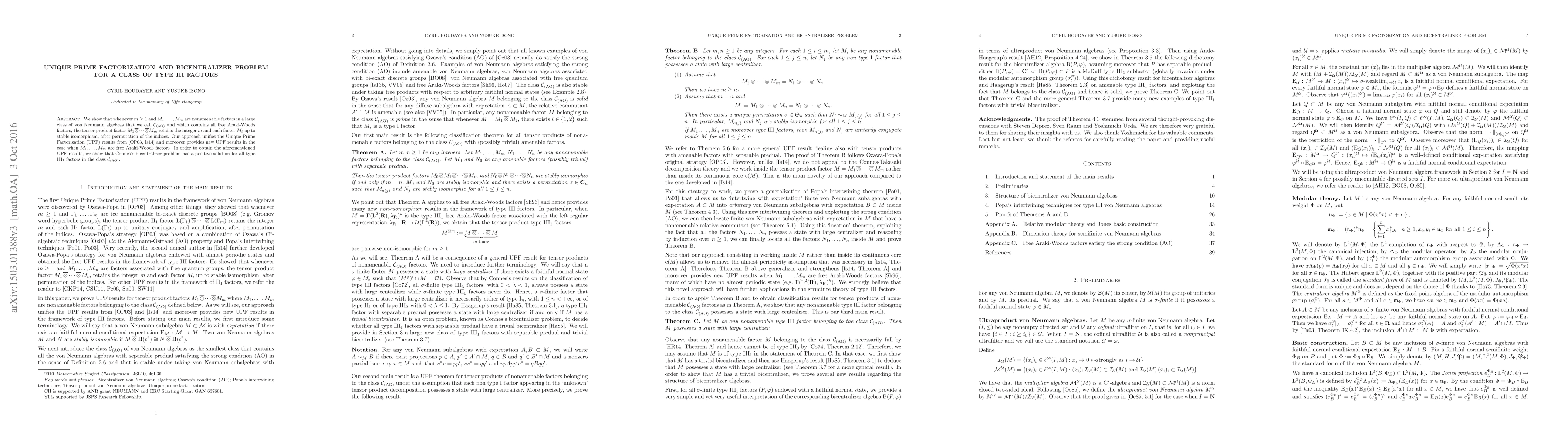 We show that whenever $m \geq 1$ and $M_1, \dots, M_m$ are nonamenable factors in a large class of von Neumann algebras that we call $\mathcal C_{(\text{AO})}$ and which contains all free Araki-Woods factors, the tensor product factor $M_1 \mathbin{\overline{\otimes}} \cdots \mathbin{\overline{\otimes}} M_m$ retains the integer $m$ and each factor $M_i$ up to stable isomorphism, after permutation of the indices. Our approach unifies the Unique Prime Factorization (UPF) results from [OP03, Is14] and moreover provides new UPF results in the case when $M_1, \dots, M_m$ are free Araki-Woods factors. In order to obtain the aforementioned UPF results, we show that Connes's bicentralizer problem has a positive solution for all type ${\rm III_1}$ factors in the class $\mathcal C_{(\text{AO})}$.