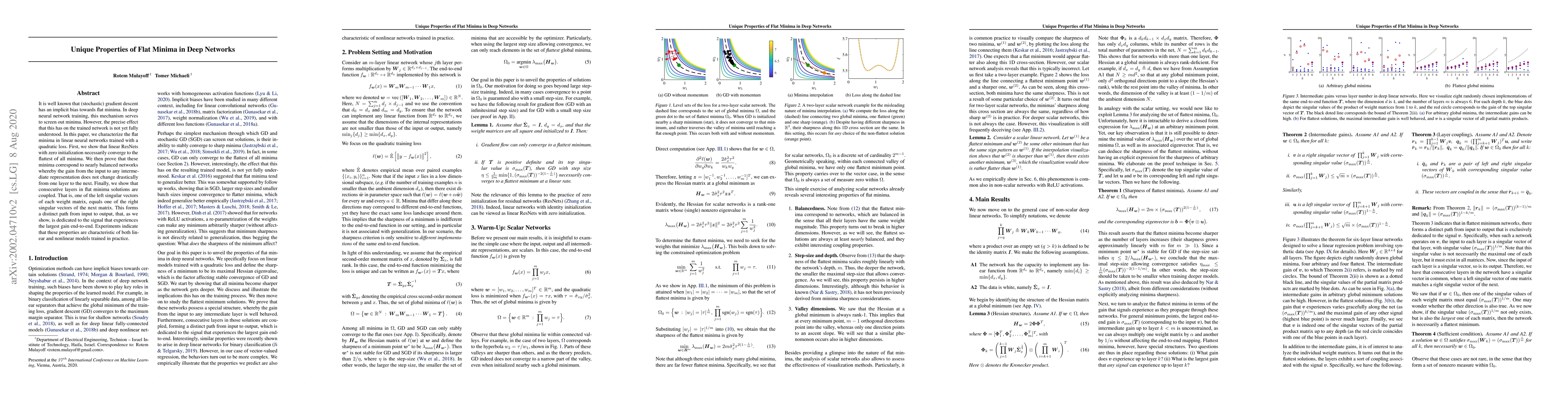 Deep neural networks trained with quadratic loss converge to flat minima where consecutive layers are coupled, forming a distinct path for the signal experiencing the largest gain. These properties are characteristic of both linear and nonlinear models.