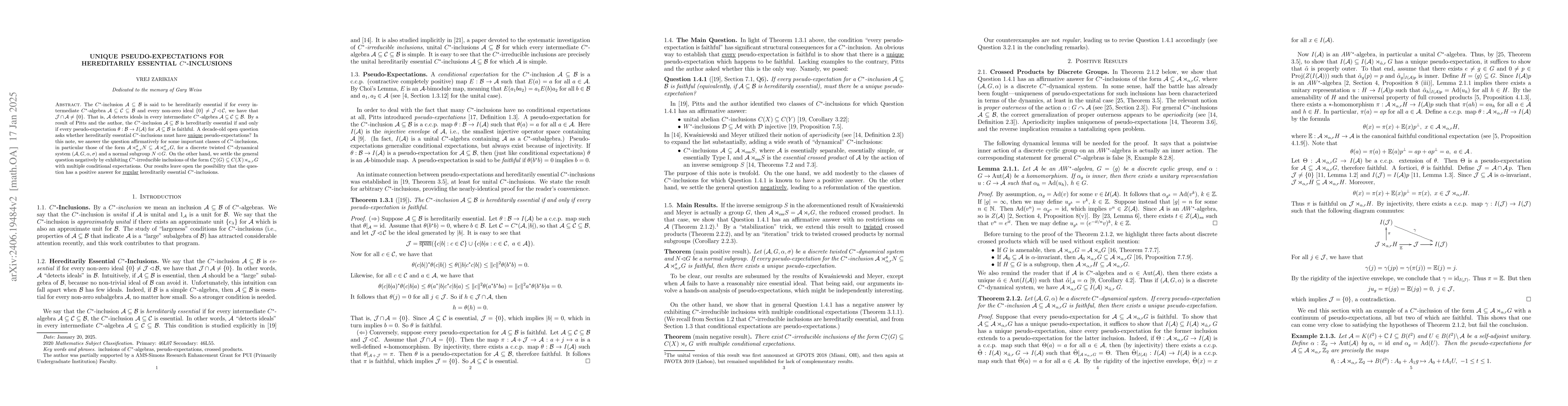 The $C^*$-inclusion $\mathcal{A} \subseteq \mathcal{B}$ is said to be hereditarily essential if for every intermediate $C^*$-algebra $\mathcal{A} \subseteq \mathcal{C} \subseteq \mathcal{B}$ and every non-zero ideal $\{0\} \neq \mathcal{J} \unlhd \mathcal{C}$, we have that $\mathcal{J} \cap \mathcal{A} \neq \{0\}$. That is, $\mathcal{A}$ detects ideals in every intermediate $C^*$-algebra $\mathcal{A} \subseteq \mathcal{C} \subseteq \mathcal{B}$. By a result of Pitts and Zarikian, a unital $C^*$-inclusion $\mathcal{A} \subseteq \mathcal{B}$ is hereditarily essential if and only if every pseudo-expectation $\theta:\mathcal{B} \to I(\mathcal{A})$ for $\mathcal{A} \subseteq \mathcal{B}$ is faithful. A decade-old open question asks whether hereditarily essential $C^*$-inclusions must have unique pseudo-expectations? In this note, we answer the question affirmatively for some important classes of $C^*$-inclusions, in particular those of the form $\mathcal{A} \subseteq \mathcal{A} \rtimes_{\alpha,r}^\sigma G$, for a twisted $C^*$-dynamical system $(\mathcal{A},G,\alpha,\sigma)$. On the other hand, we settle the general question negatively by exhibiting $C^*$-irreducible inclusions of the form $C_r^*(G) \subseteq C(X) \rtimes_{\alpha,r} G$ with multiple conditional expectations. Our results leave open the possibility that the question might have a positive answer for regular hereditarily essential $C^*$-inclusions.