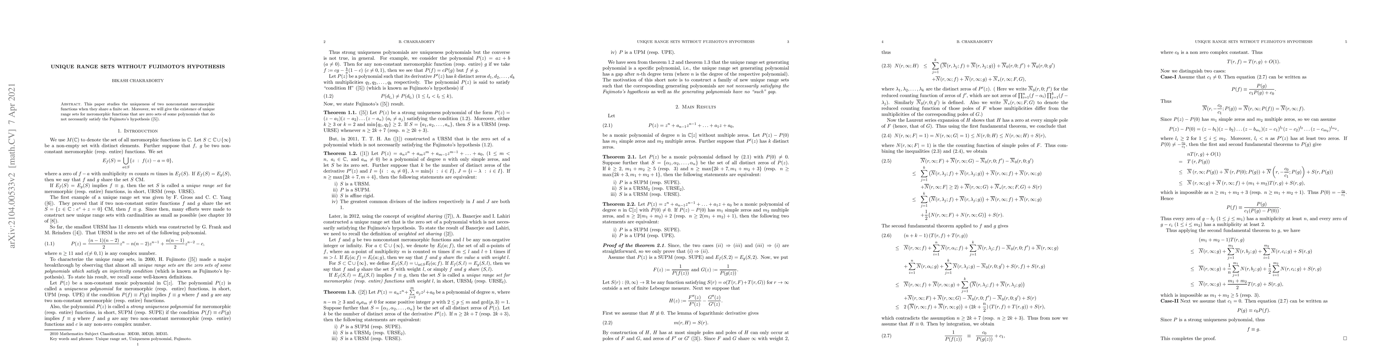 This paper explores the uniqueness of two non-constant meromorphic functions sharing a finite set, and establishes the existence of unique range sets for meromorphic functions defined by polynomials, even when Fujimoto's hypothesis does not hold.