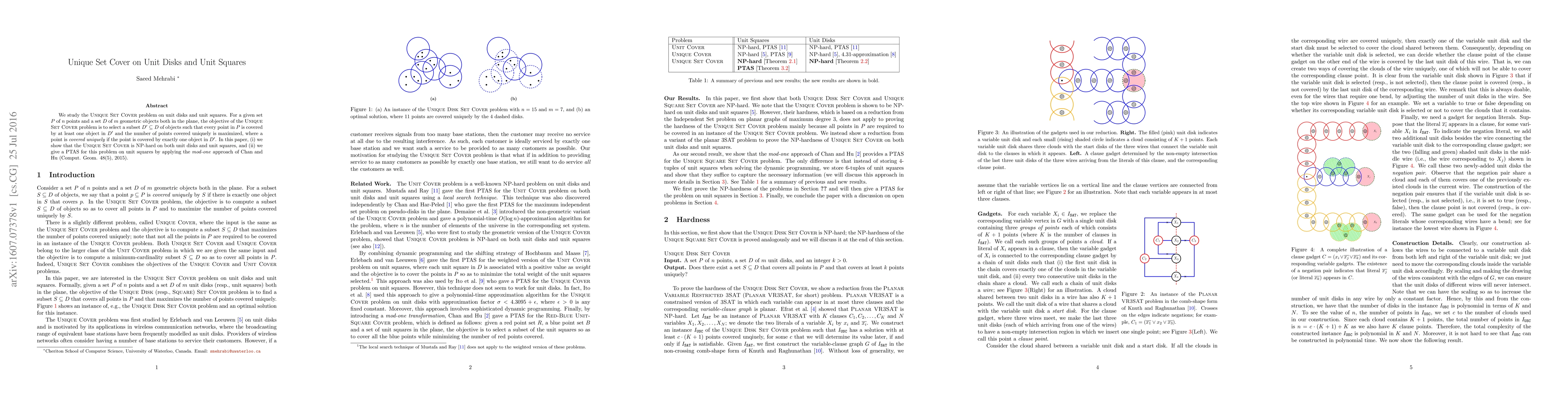 This paper investigates the Unique Set Cover problem for unit disks and squares, proving its NP-hardness for both shapes. It also provides a Polynomial Time Approximation Scheme (PTAS) for unit squares using Chan and Hu's mod-one technique.