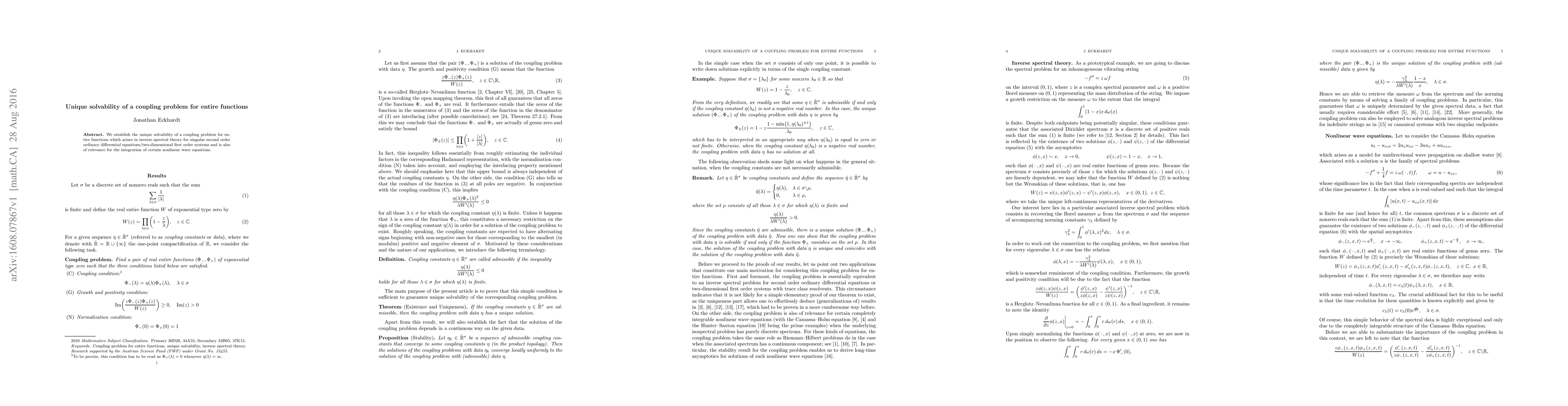 This research paper proves the unique solvability of a coupling problem for entire functions, significant for inverse spectral theory of singular differential equations and nonlinear wave equation integration.