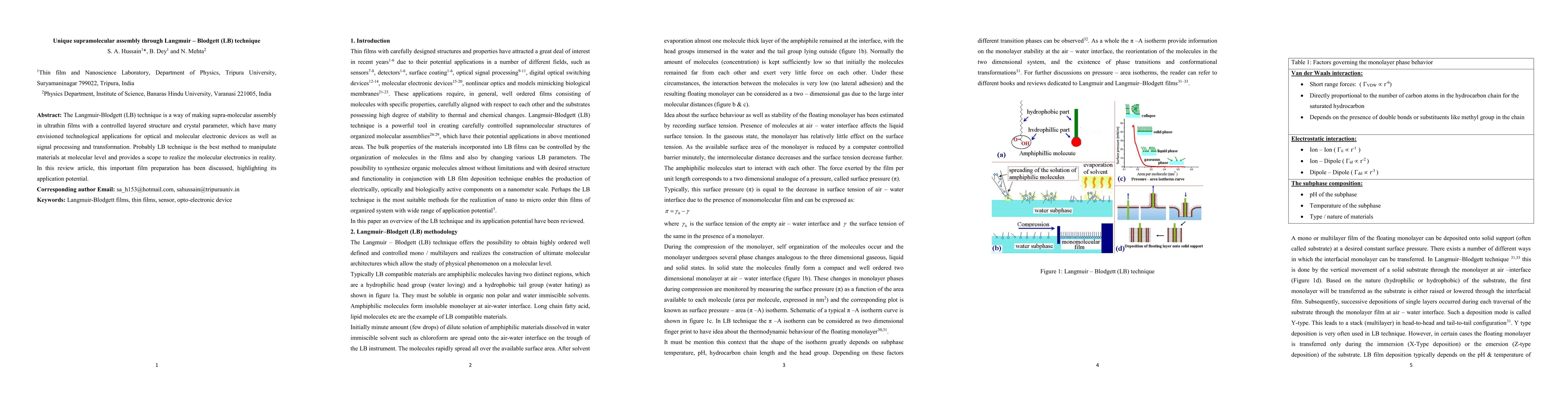 The Langmuir-Blodgett (LB) technique is a way of making supra-molecular assembly in ultrathin films with a controlled layered structure and crystal parameter, which have many envisioned technological applications for optical and molecular electronic devices as well as signal processing and transformation. Probably LB technique is the best method to manipulate materials at molecular level and provides a scope to realize the molecular electronics in reality. In this review article, this important film preparation has been discussed, highlighting its application potential.