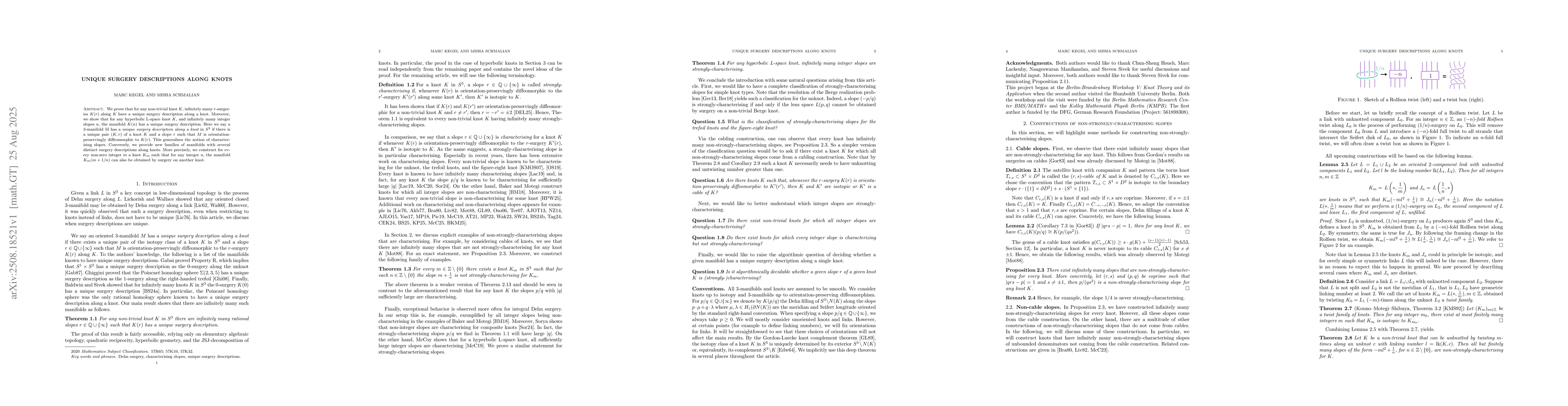 We prove that for any non-trivial knot K, infinitely many r-surgeries K(r) along K have a unique surgery description along a knot. Moreover, we show that for any hyperbolic L-space knot K and infinitely many integer slopes n, the manifold K(n) has a unique surgery description. Here we say a 3-manifold M has a unique surgery description along a knot in S^3 if there is a unique pair (K,r) of a knot K and a slope r such that M is orientation-preservingly diffeomorphic to K(r). This generalises the notion of characterising slopes. Conversely, we provide new families of manifolds with several distinct surgery descriptions along knots. More precisely, we construct for every non-zero integer m a knot K_m such that for any integer n, the manifold K_m(m+1/n) can also be obtained by surgery on another knot.