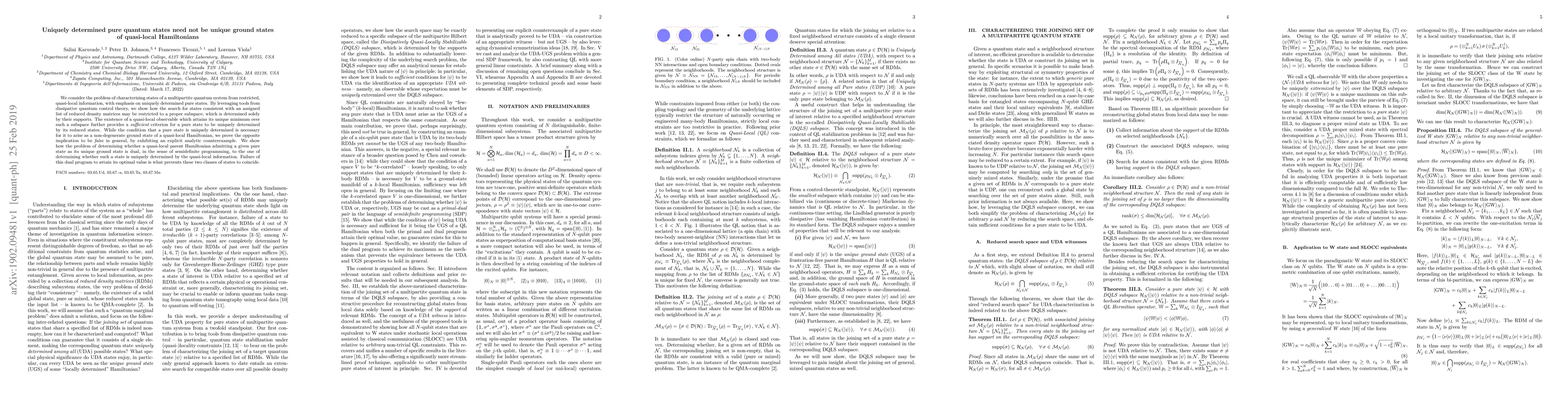 We consider the problem of characterizing states of a multipartite quantum system from restricted, quasi-local information, with emphasis on uniquely determined pure states. By leveraging tools from dissipative quantum control theory, we show how the search for states consistent with an assigned list of reduced density matrices may be restricted to a proper subspace, which is determined solely by their supports. The existence of a quasi-local observable which attains its unique minimum over such a subspace further provides a sufficient criterion for a pure state to be uniquely determined by its reduced states. While the condition that a pure state is uniquely determined is necessary for it to arise as a non-degenerate ground state of a quasi-local Hamiltonian, we prove the opposite implication to be false in general, by exhibiting an explicit analytic counterexample. We show how the problem of determining whether a quasi-local parent Hamiltonian admitting a given pure state as its unique ground state is dual, in the sense of semidefinite programming, to the one of determining whether such a state is uniquely determined by the quasi-local information. Failure of this dual program to attain its optimal value is what prevents these two classes of states to coincide.