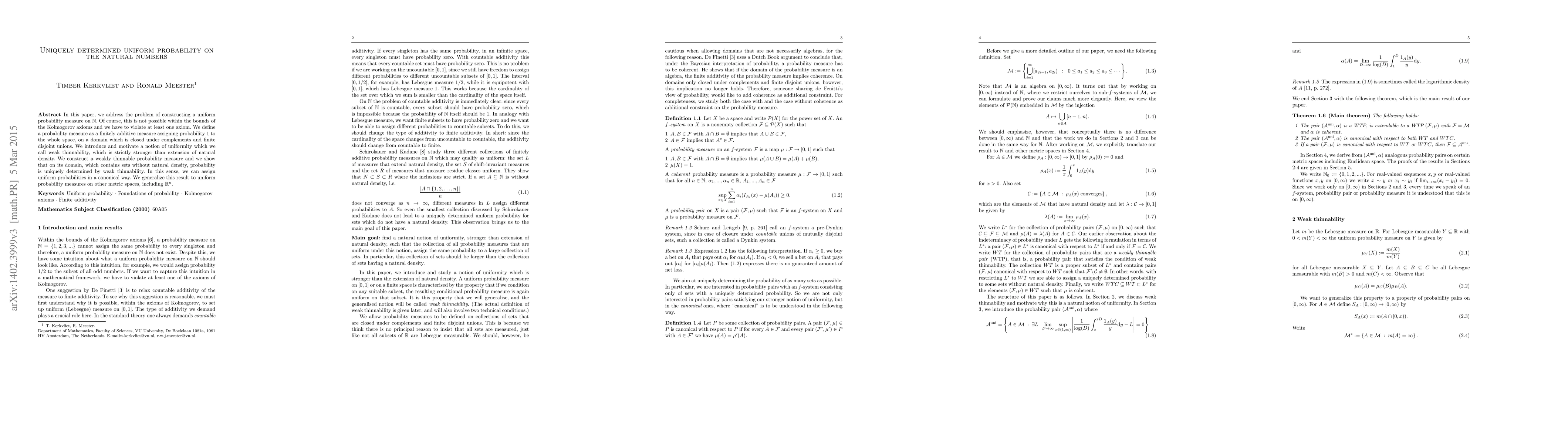 In this paper, we address the problem of constructing a uniform probability measure on $\mathbb{N}$. Of course, this is not possible within the bounds of the Kolmogorov axioms and we have to violate at least one axiom. We define a probability measure as a finitely additive measure assigning probability $1$ to the whole space, on a domain which is closed under complements and finite disjoint unions. We introduce and motivate a notion of uniformity which we call weak thinnability, which is strictly stronger than extension of natural density. We construct a weakly thinnable probability measure and we show that on its domain, which contains sets without natural density, probability is uniquely determined by weak thinnability. In this sense, we can assign uniform probabilities in a canonical way. We generalize this result to uniform probability measures on other metric spaces, including $\mathbb{R}^n$.