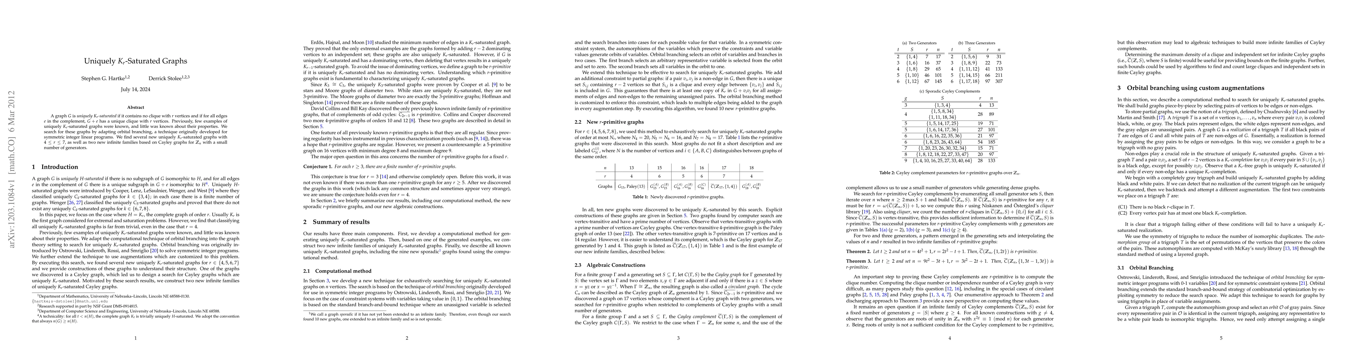 This paper explores uniquely K_r-saturated graphs, which avoid r-cliques and have a unique r-clique when any edge is added to their complement. Using orbital branching, the authors identify new finite examples for r between 4 and 7 and two infinite families based on Cayley graphs of Z_n.