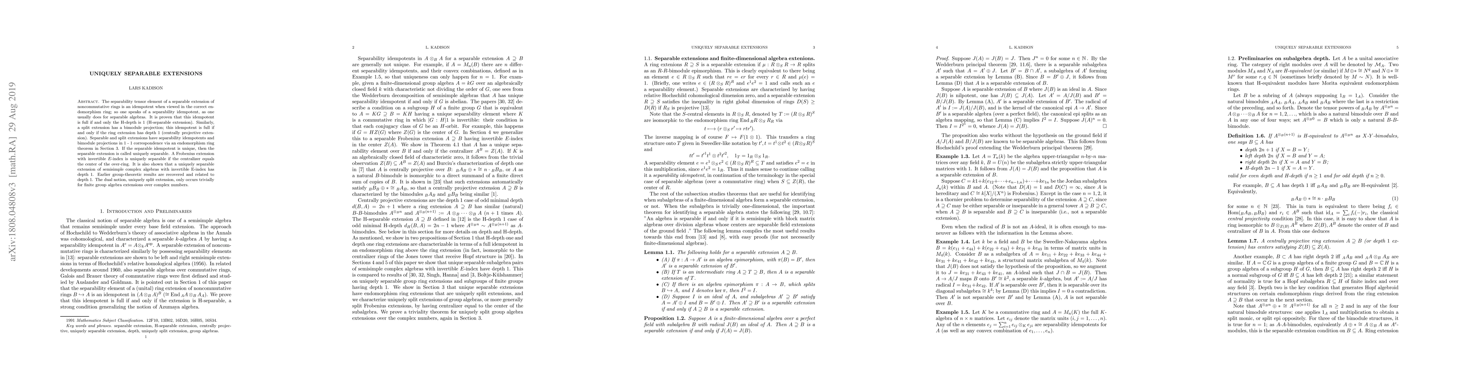 This paper explores uniquely separable extensions of noncommutative rings, showing that separability idempotents correspond one-to-one with bimodule projections under certain conditions. It establishes that a uniquely separable extension has depth 1 and relates these findings to Frobenius extensions and group-theoretic results.