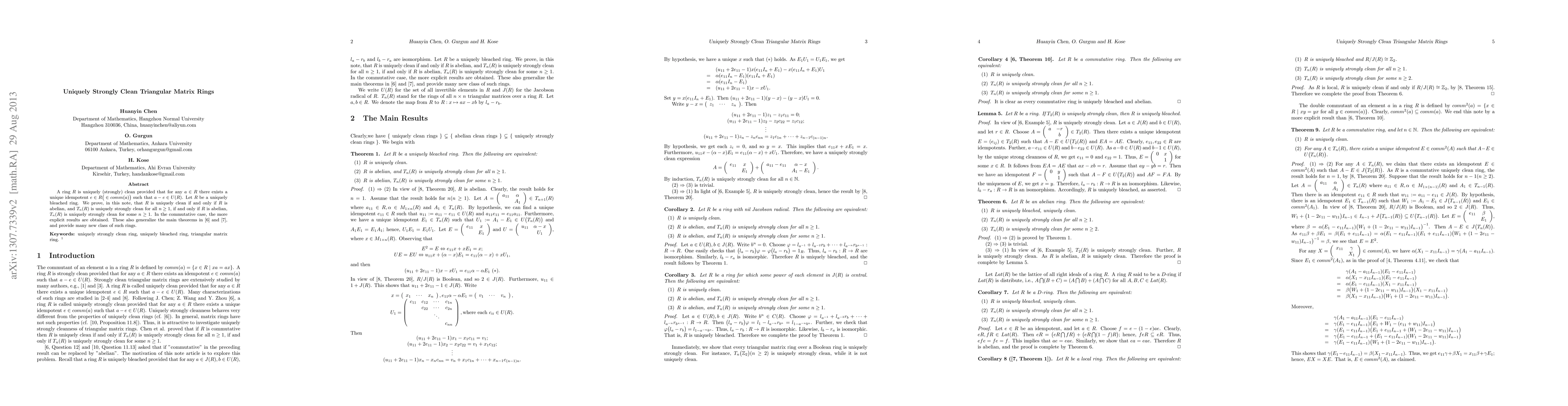 A ring $R$ is uniquely (strongly) clean provided that for any $a\in R$ there exists a unique idempotent $e\in R \big(\in comm(a)\big)$ such that $a-e\in U(R)$. Let $R$ be a uniquely bleached ring. We prove, in this note, that $R$ is uniquely clean if and only if $R$ is abelian, and $T_n(R)$ is uniquely strongly clean for all $n\geq 1$, if and only if $R$ is abelian, $T_n(R)$ is uniquely strongly clean for some $n\geq 1$. In the commutative case, the more explicit results are obtained. These also generalize the main theorems in [6] and [7], and provide many new class of such rings.