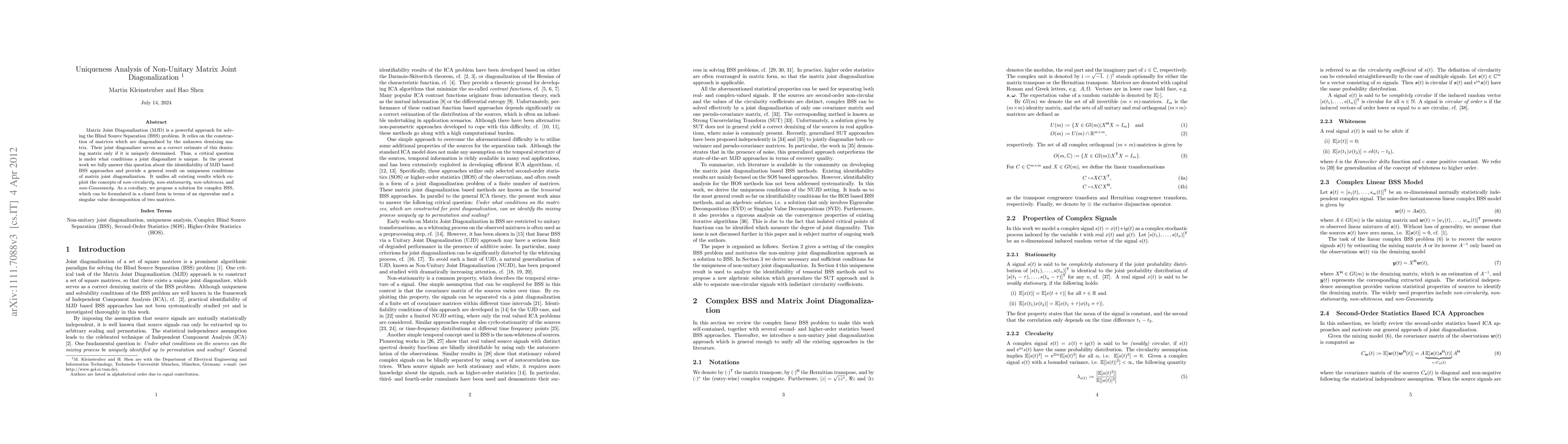 This paper investigates the uniqueness conditions for Non-Unitary Matrix Joint Diagonalization (MJD) in Blind Source Separation (BSS). It provides a comprehensive analysis that unifies existing results on non-circularity, non-stationarity, and non-Gaussianity, leading to a closed-form solution for complex BSS based on eigenvalue and singular value decomposition.