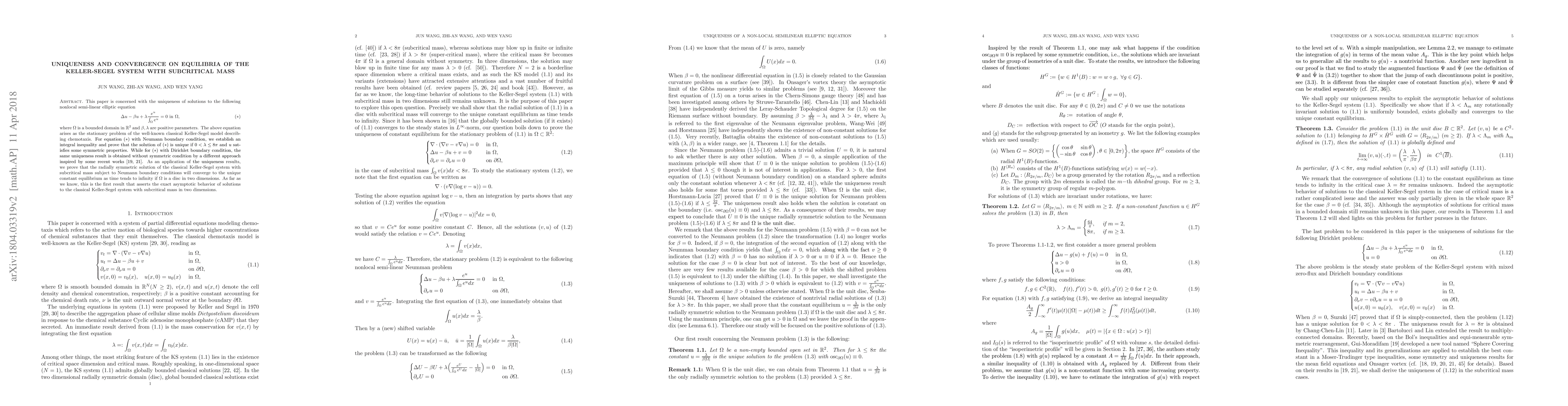 This paper is concerned with the uniqueness of solutions to the following nonlocal semi-linear elliptic equation \begin{equation}\label{ellip}\tag{$\ast$} \Delta u-\beta u+\lambda\frac{e^u}{\int_{\Omega}e^u}=0~\mathrm{in}~\Omega, \end{equation} where $\Omega$ is a bounded domain in $\mathbb{R}^2$ and $\beta, \lambda$ are positive parameters. The above equation arises as the stationary problem of the well-known classical Keller-Segel model describing chemotaxis. For equation \eqref{ellip} with Neumann boundary condition, we establish an integral inequality and prove that the solution of (\ref{ellip}) is unique if $0<\lambda \leq 8\pi$ and $u$ satisfies some symmetric properties. While for \eqref{ellip} with Dirichlet boundary condition, the same uniqueness result is obtained without symmetric condition by a different approach inspired by some recent works [19,21]. As an application of the uniqueness results, we prove that the radially symmetric solution of the classical Keller-Segel system with subcritical mass subject to Neumann boundary conditions will converge to the unique constant equilibrium as time tends to infinity if $\Omega$ is a disc in two dimensions. As far as we know, this is the first result that asserts the exact asymptotic behavior of solutions to the classical Keller-Segel system with subcritical mass in two dimensions.