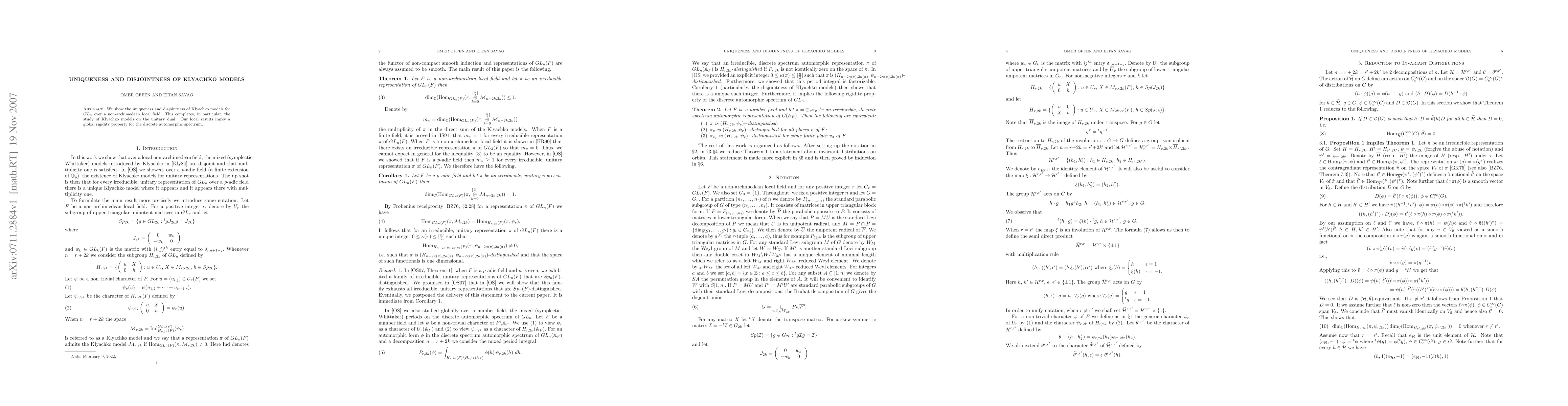 We show the uniqueness and disjointness of Klyachko models for GL(n,F) over a non-archimedean local field F. This completes, in particular, the study of Klyachko models on the unitary dual. Our local results imply a global rigidity property for the discrete automorphic spectrum.