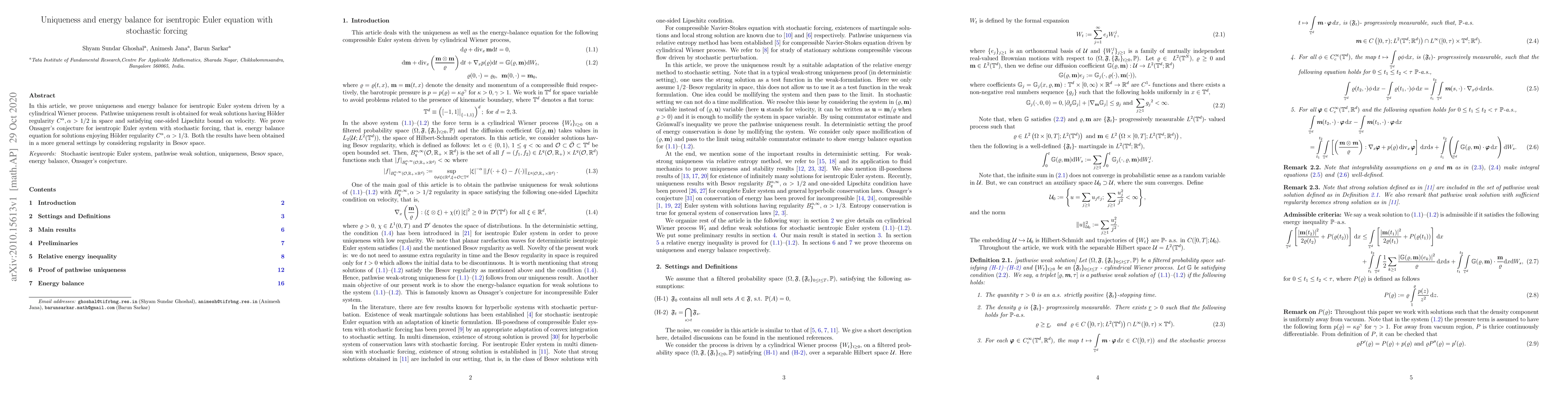 This paper proves uniqueness and energy balance for the isentropic Euler system influenced by stochastic forcing via a cylindrical Wiener process. It establishes pathwise uniqueness for weak solutions with H\"older regularity $C^{\alpha}$ ($\alpha > 1/2$) and an energy balance equation for solutions with regularity $C^{\alpha}$ ($\alpha > 1/3$), confirming Onsager's conjecture in this context.