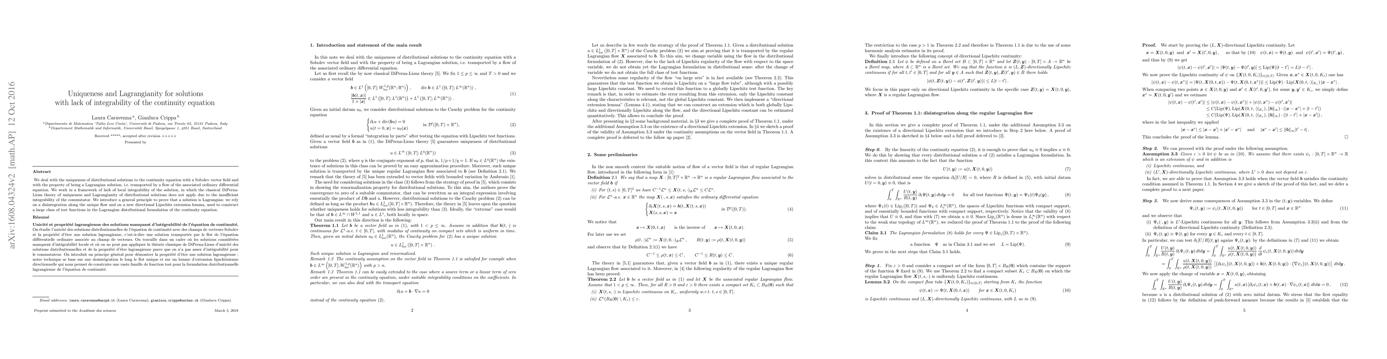 This paper explores the uniqueness and Lagrangianity of distributional solutions to the continuity equation when the vector field lacks local integrability. It introduces a new principle to prove Lagrangianity using disintegration along the unique flow and a directional Lipschitz extension lemma to construct test functions.