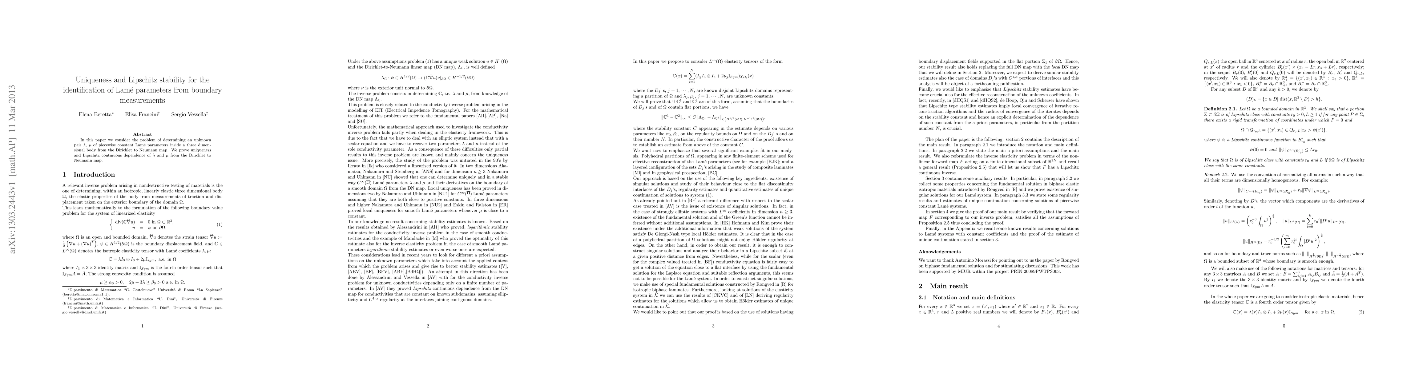In this paper we consider the problem of determining an unknown pair $\lambda$, $\mu$ of piecewise constant Lam\'{e} parameters inside a three dimensional body from the Dirichlet to Neumann map. We prove uniqueness and Lipschitz continuous dependence of $\lambda$ and $\mu$ from the Dirichlet to Neumann map.