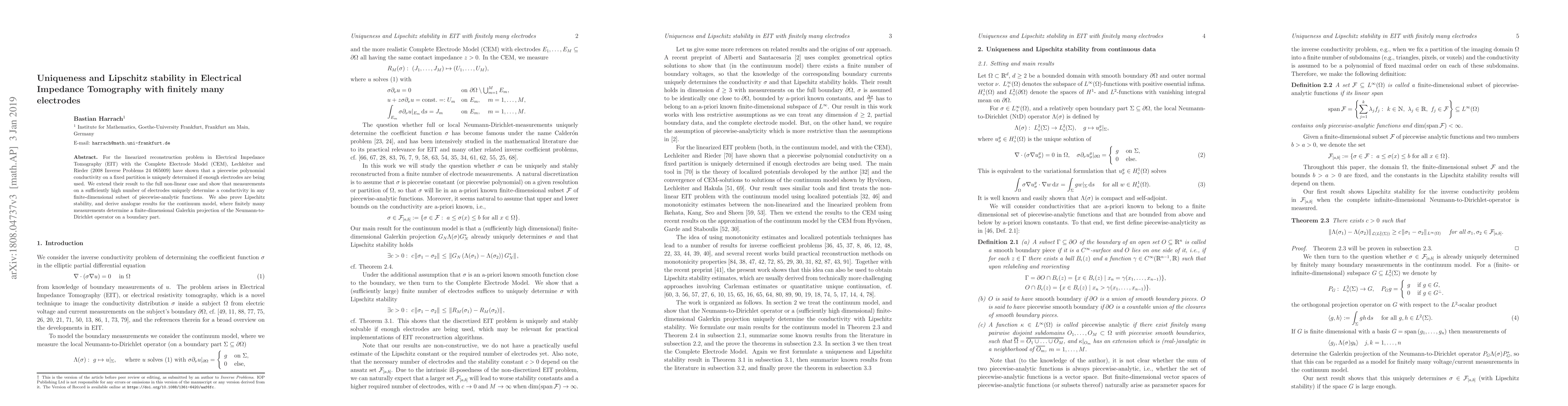 For the linearized reconstruction problem in Electrical Impedance Tomography (EIT) with the Complete Electrode Model (CEM), Lechleiter and Rieder (2008 Inverse Problems 24 065009) have shown that a piecewise polynomial conductivity on a fixed partition is uniquely determined if enough electrodes are being used. We extend their result to the full non-linear case and show that measurements on a sufficiently high number of electrodes uniquely determine a conductivity in any finite-dimensional subset of piecewise-analytic functions. We also prove Lipschitz stability, and derive analogue results for the continuum model, where finitely many measurements determine a finite-dimensional Galerkin projection of the Neumann-to-Dirichlet operator on a boundary part.