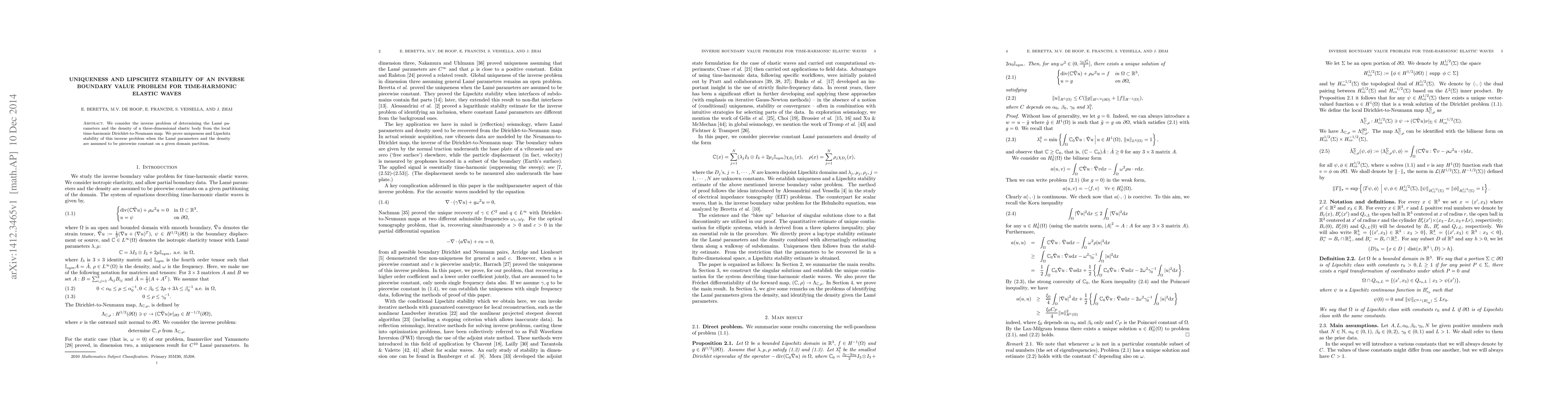 We consider the inverse problem of determining the Lam\'{e} parameters and the density of a three-dimensional elastic body from the local time-harmonic Dirichlet-to-Neumann map. We prove uniqueness and Lipschitz stability of this inverse problem when the Lam\'{e} parameters and the density are assumed to be piecewise constant on a given domain partition.