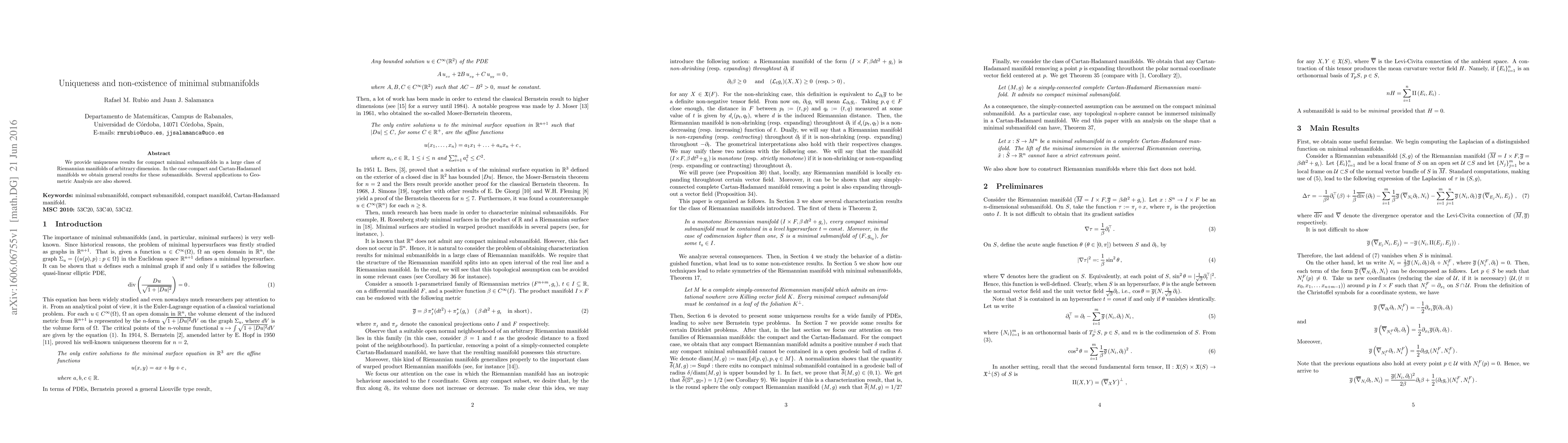 We provide uniqueness results for compact minimal submanifolds in a large class of Riemannian manifolds of arbitrary dimension. In the case compact and Cartan-Hadamard manifolds we obtain general results for these submanifolds. Several applications to Geometric Analysis are also showed.