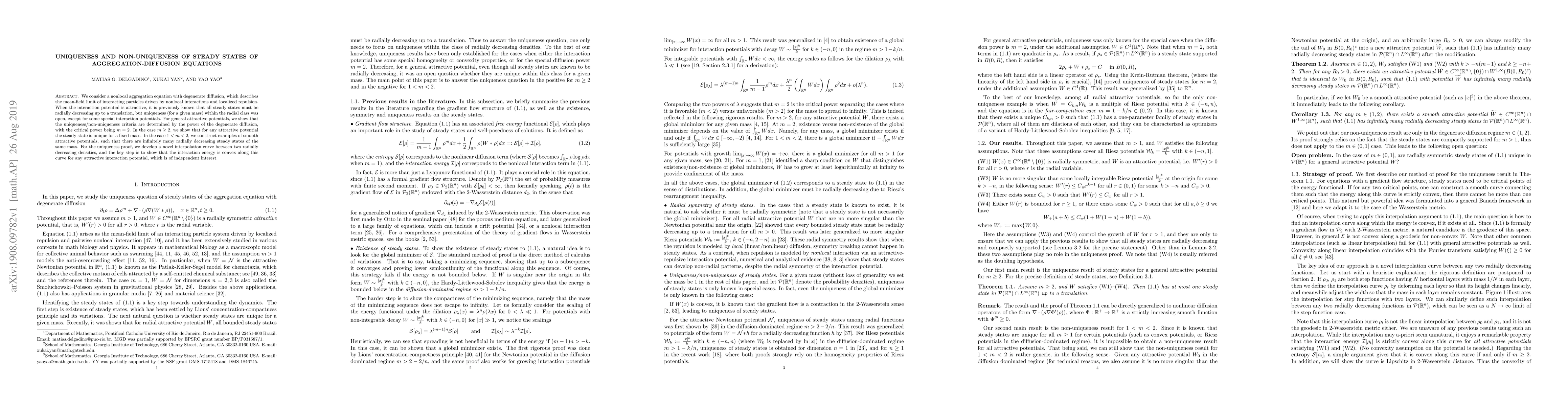This paper investigates the uniqueness and non-uniqueness of steady states for a nonlocal aggregation-diffusion equation. It reveals that the critical power $m = 2$ of the degenerate diffusion determines the uniqueness criteria; for $m \ge 2$, uniqueness holds, while for $1 < m < 2$, infinitely many radially decreasing steady states exist.