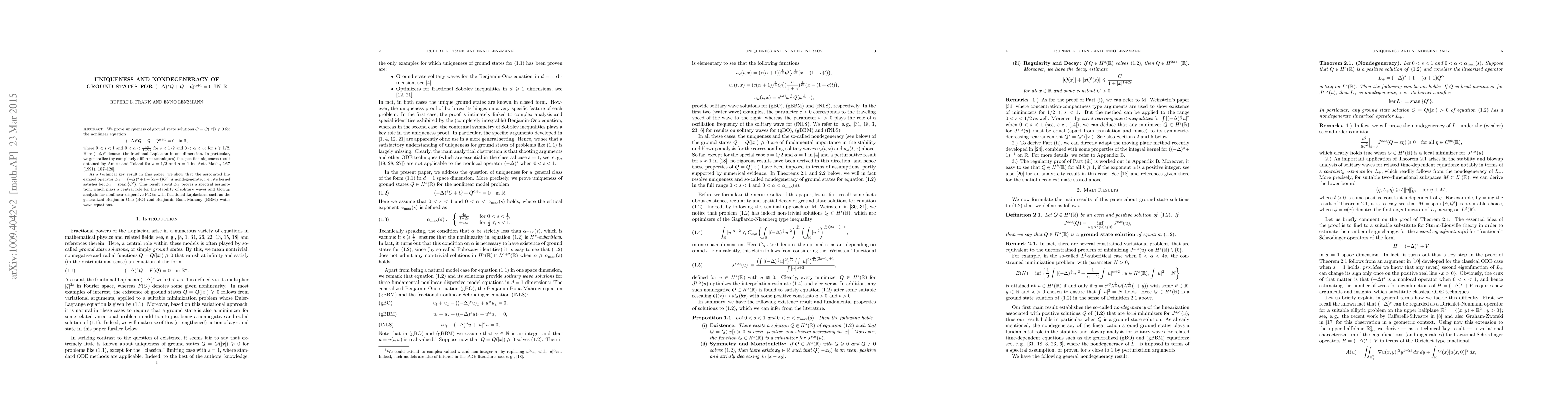 We prove uniqueness of ground state solutions $Q = Q(|x|) \geq 0$ for the nonlinear equation $(-\Delta)^s Q + Q - Q^{\alpha+1}= 0$ in $\mathbb{R}$, where $0 < s < 1$ and $0 < \alpha < \frac{4s}{1-2s}$ for $s < 1/2$ and $0 < \alpha < \infty$ for $s \geq 1/2$. Here $(-\Delta)^s$ denotes the fractional Laplacian in one dimension. In particular, we generalize (by completely different techniques) the specific uniqueness result obtained by Amick and Toland for $s=1/2$ and $\alpha=1$ in [Acta Math., \textbf{167} (1991), 107--126]. As a technical key result in this paper, we show that the associated linearized operator $L_+ = (-\Delta)^s + 1 - (\alpha+1) Q^\alpha$ is nondegenerate; i.\,e., its kernel satisfies $\mathrm{ker}\, L_+ = \mathrm{span}\, \{Q'\}$. This result about $L_+$ proves a spectral assumption, which plays a central role for the stability of solitary waves and blowup analysis for nonlinear dispersive PDEs with fractional Laplacians, such as the generalized Benjamin-Ono (BO) and Benjamin-Bona-Mahony (BBM) water wave equations.