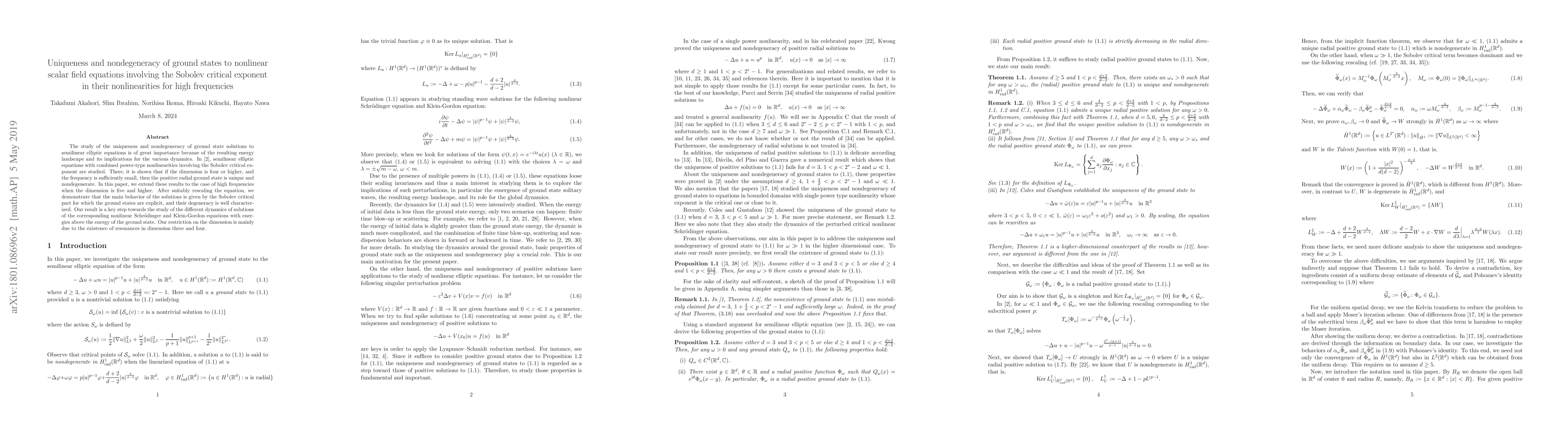 This paper extends the uniqueness and nondegeneracy of ground state solutions to semilinear elliptic equations with Sobolev critical exponent nonlinearities to high frequencies, showing that in dimensions five and higher, the ground states are unique and nondegenerate, providing insight into the dynamics of nonlinear scalar field equations.