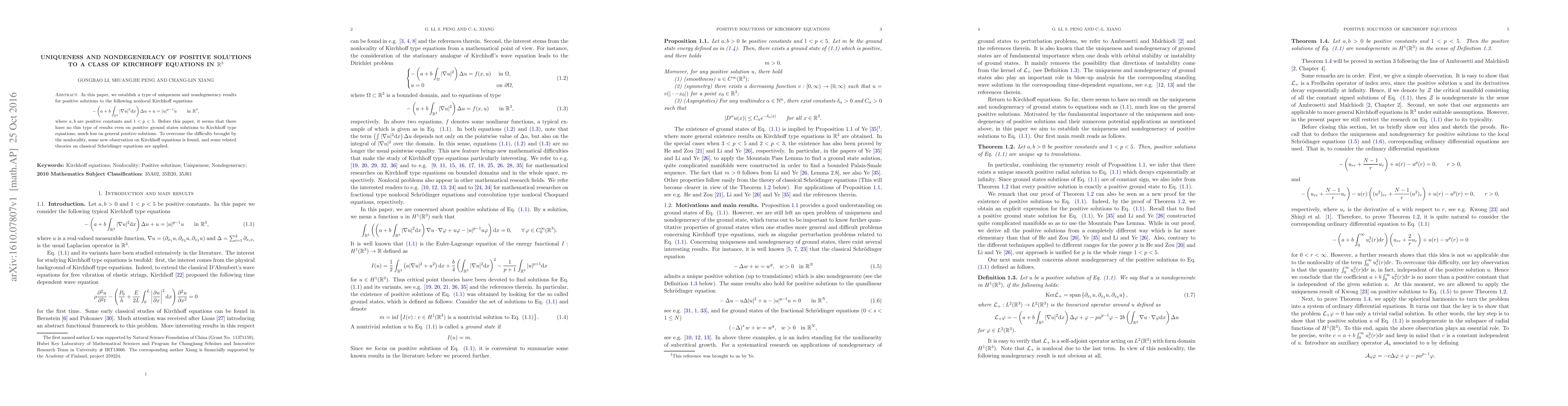 In this paper, we establish a type of uniqueness and nondegeneracy results for positive solutions to the following nonlocal Kirchhoff equations \begin{eqnarray*} -\left(a+b\int_{\mathbb{R}^{3}}|\nabla u|^{2}\text{d} x\right)\Delta u+u=|u|^{p-1}u & & \text{in }\mathbb{R}^{3}, \end{eqnarray*} where $a,b$ are positive constants and $1