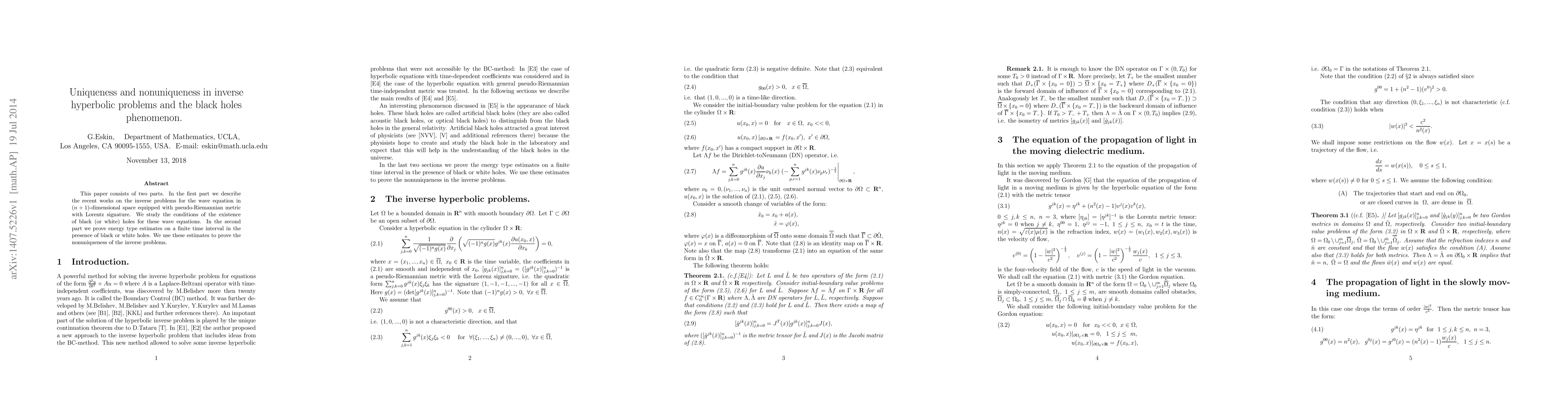This paper consists of two parts. In the first part we describe the recent works on the inverse problems for the wave equation in $(n+1)$-dimensional space equipped with pseudo-Riemannian metric with Lorentz signature. We study the conditions of the existence of black (or white) holes for these wave equations. In the second part we prove energy type estimates on a finite time interval in the presence of black or white holes. We use these estimates to prove the nonuniqueness of the inverse problems.