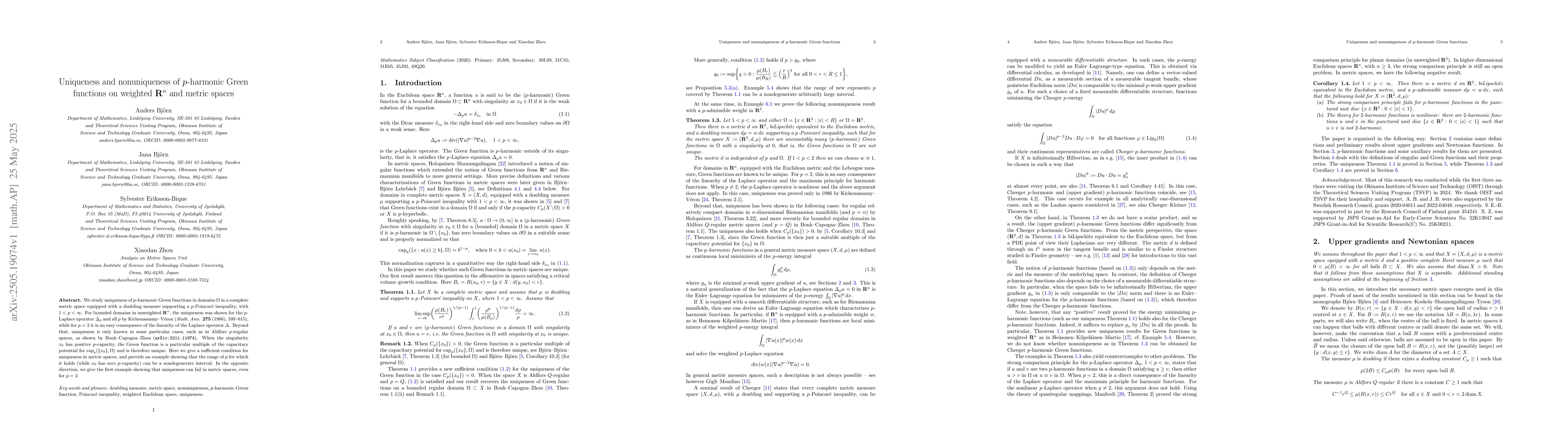 The research investigates uniqueness and nonuniqueness of p-harmonic Green functions in domains Ω within complete metric spaces equipped with a doubling measure supporting a p-Poincaré inequality, for 1<p<∞.